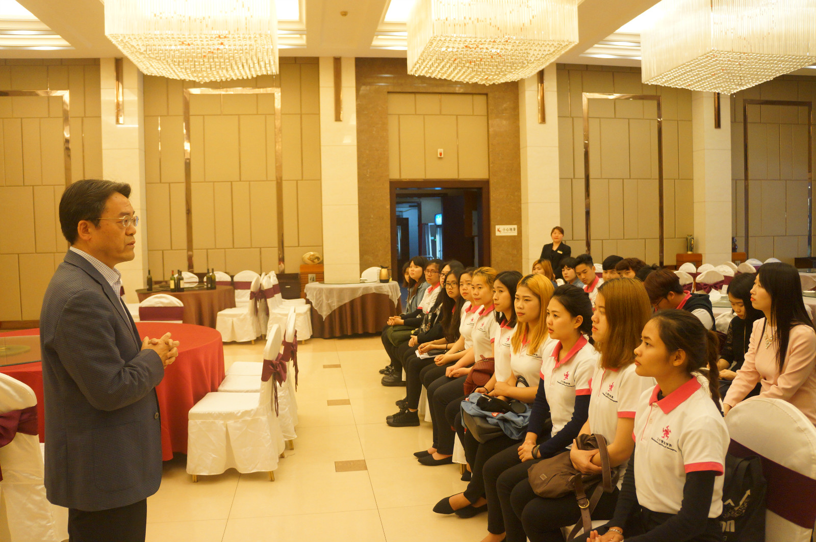 2017年4月13日下午,国际公司党总支书记兼副经理刘猛一行在桂园宾馆部门负责人陪同下,来到桂园宾馆餐饮部看望慰问实习的20名第五届泰国正大管理公司"1+1+2"商务汉语项目班的同学。