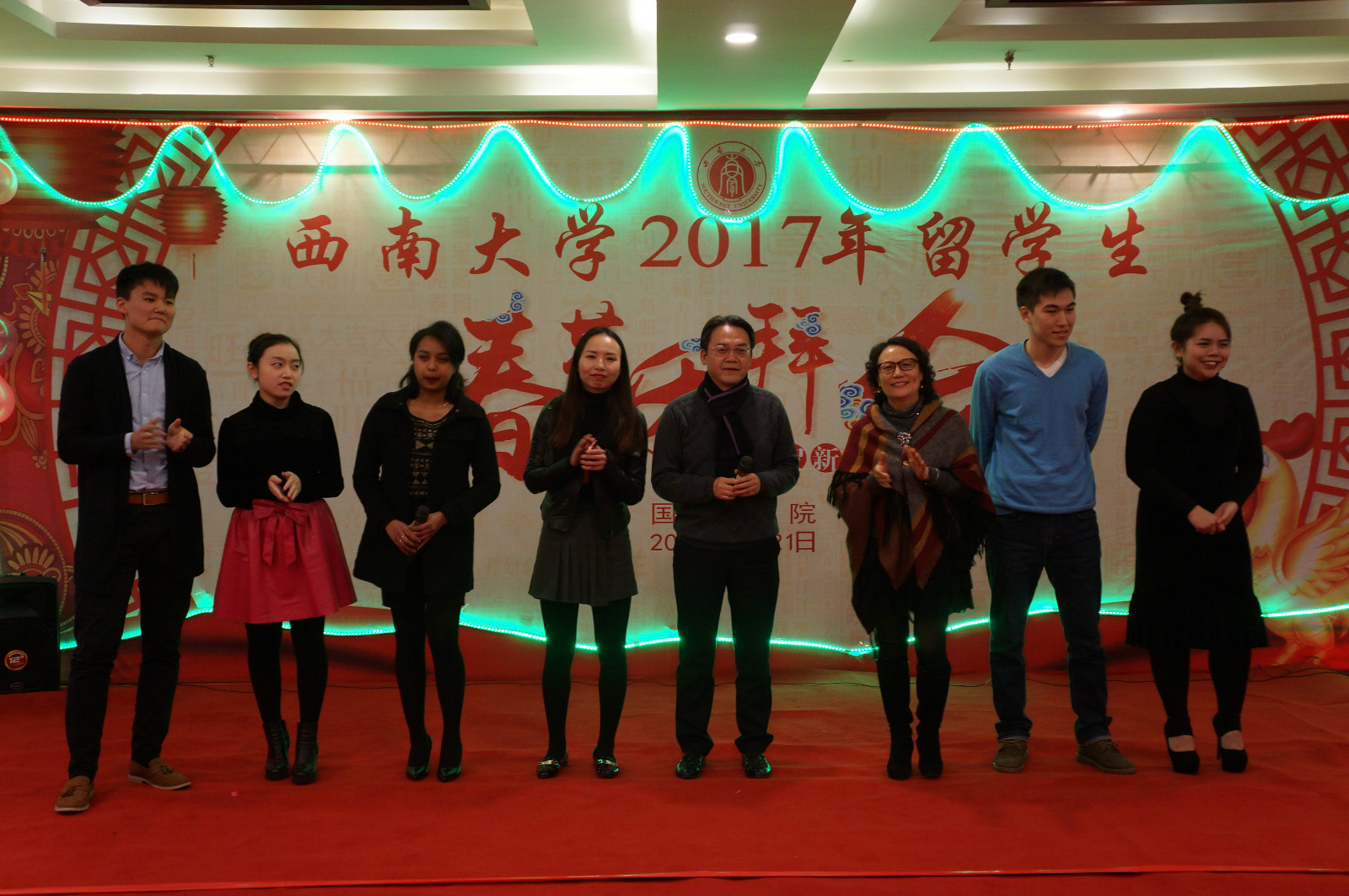 团拜会上,活动不断、精彩连连。来自非洲、美洲、大洋洲等地区同学们带来的舞蹈,充满异域风情;师生们联袂带来的中国传统歌曲串烧和合唱《难忘今宵》,和谐融洽。