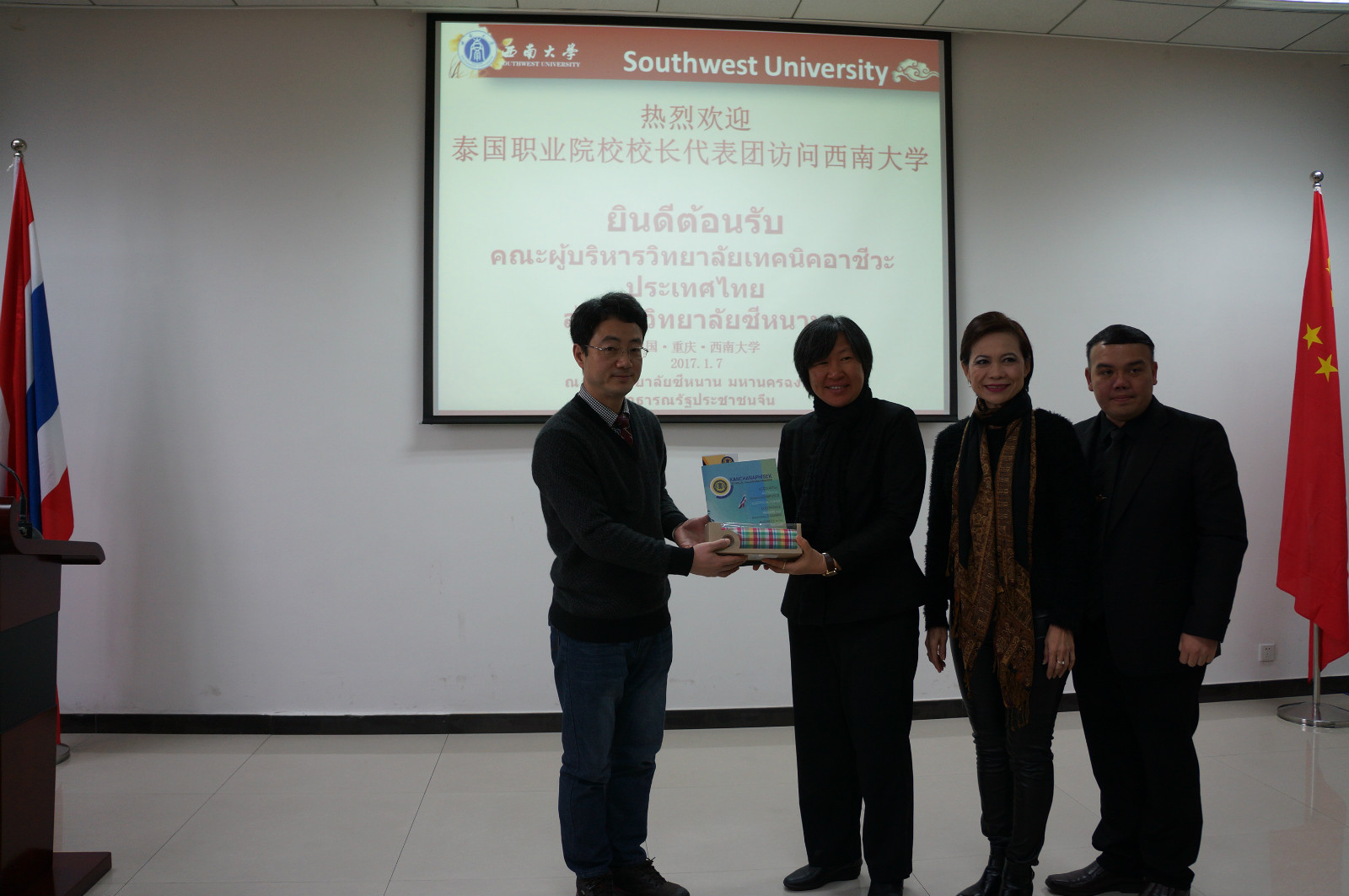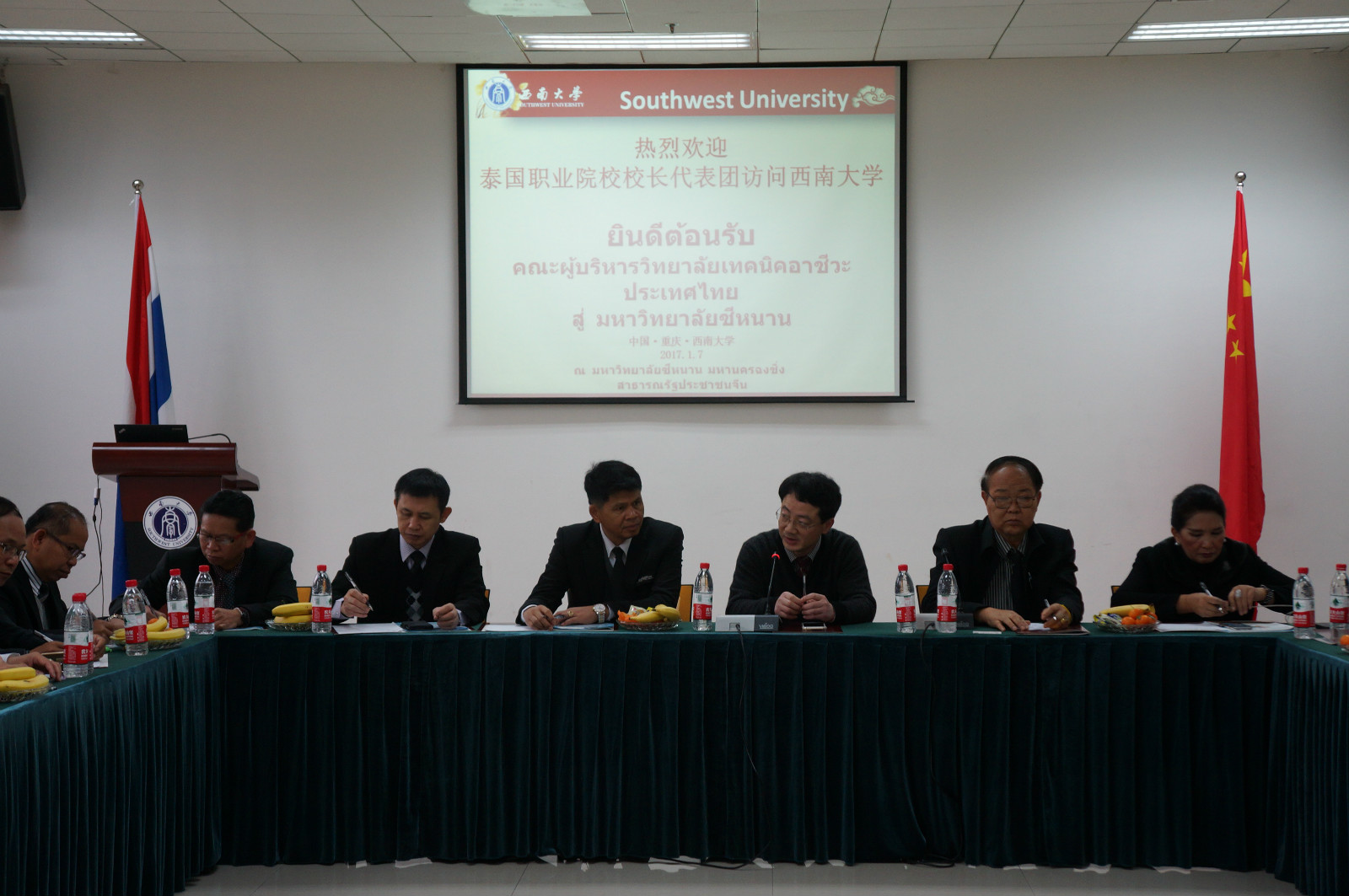 1月6日,由泰国教育部职业教育委员会主办、孔敬大学孔子公司承办的泰国职业院校来华代表团访问公司并谋求合作,成员包括来自泰国26所高等职业院校的28名董事长、副董事长。