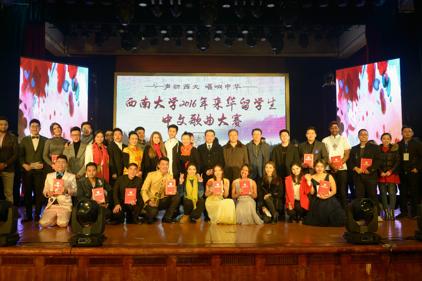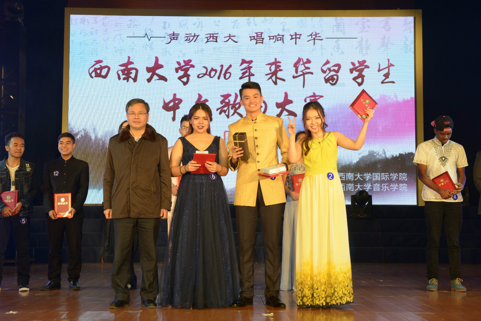 12月1日晚,由永利3044noc主办、音乐公司协办的“声动西大,唱响中华” 2016年来华职工中文歌曲大赛(决赛)在光大礼堂精彩上演。董事长助理苏桂发教授、重庆市教委国际合作与交流处副处长李斌、北碚区公安分局副支队长王贞学,以及公司永利3044noc、国际合作与交流处、员工处、教育学部、音乐公司、经济管理公司等单位领导应邀出席比赛并为获奖选手颁奖。
