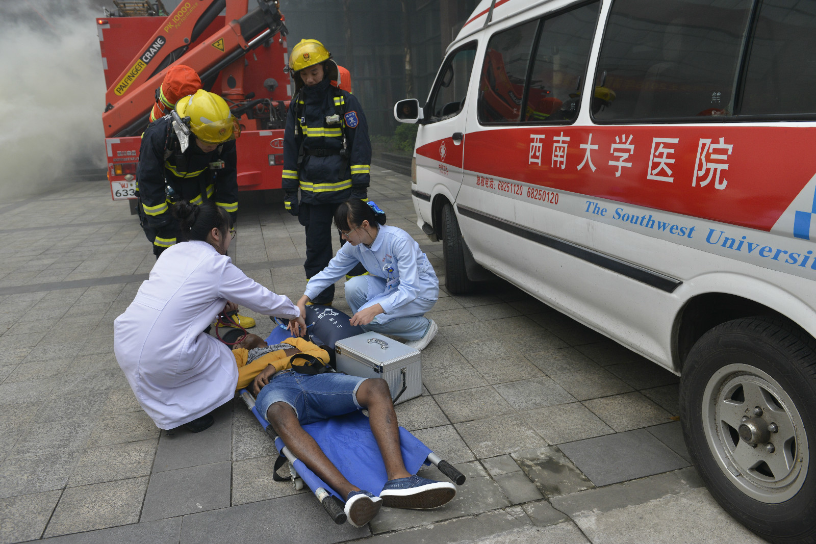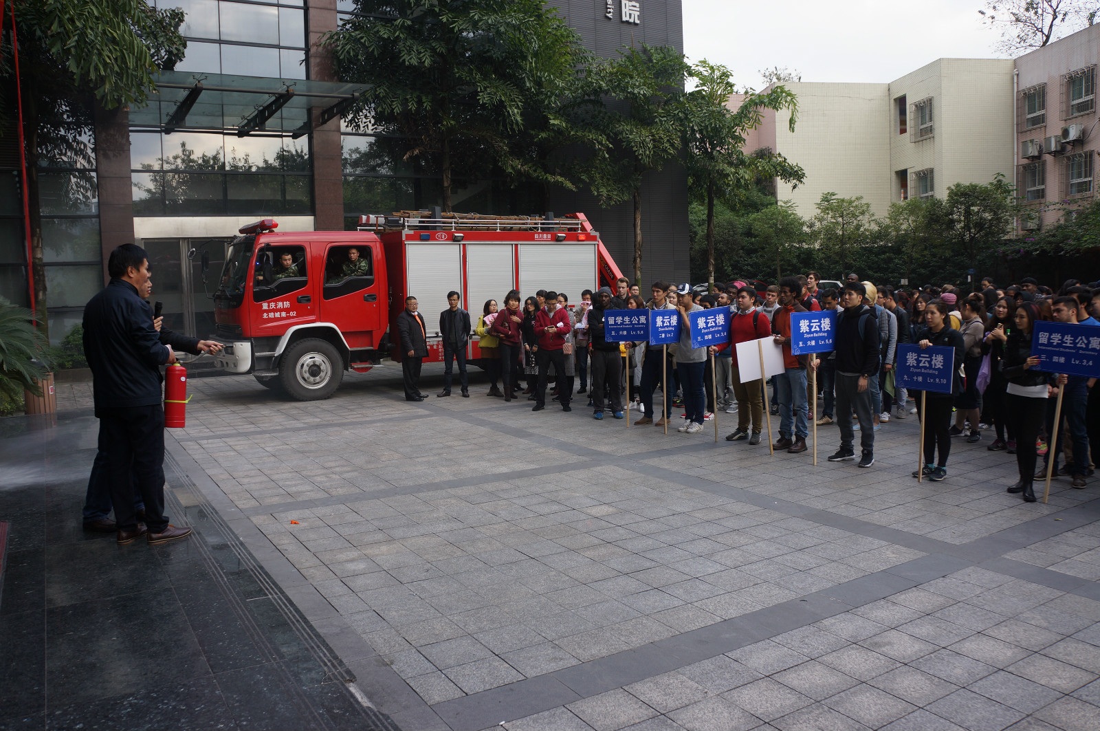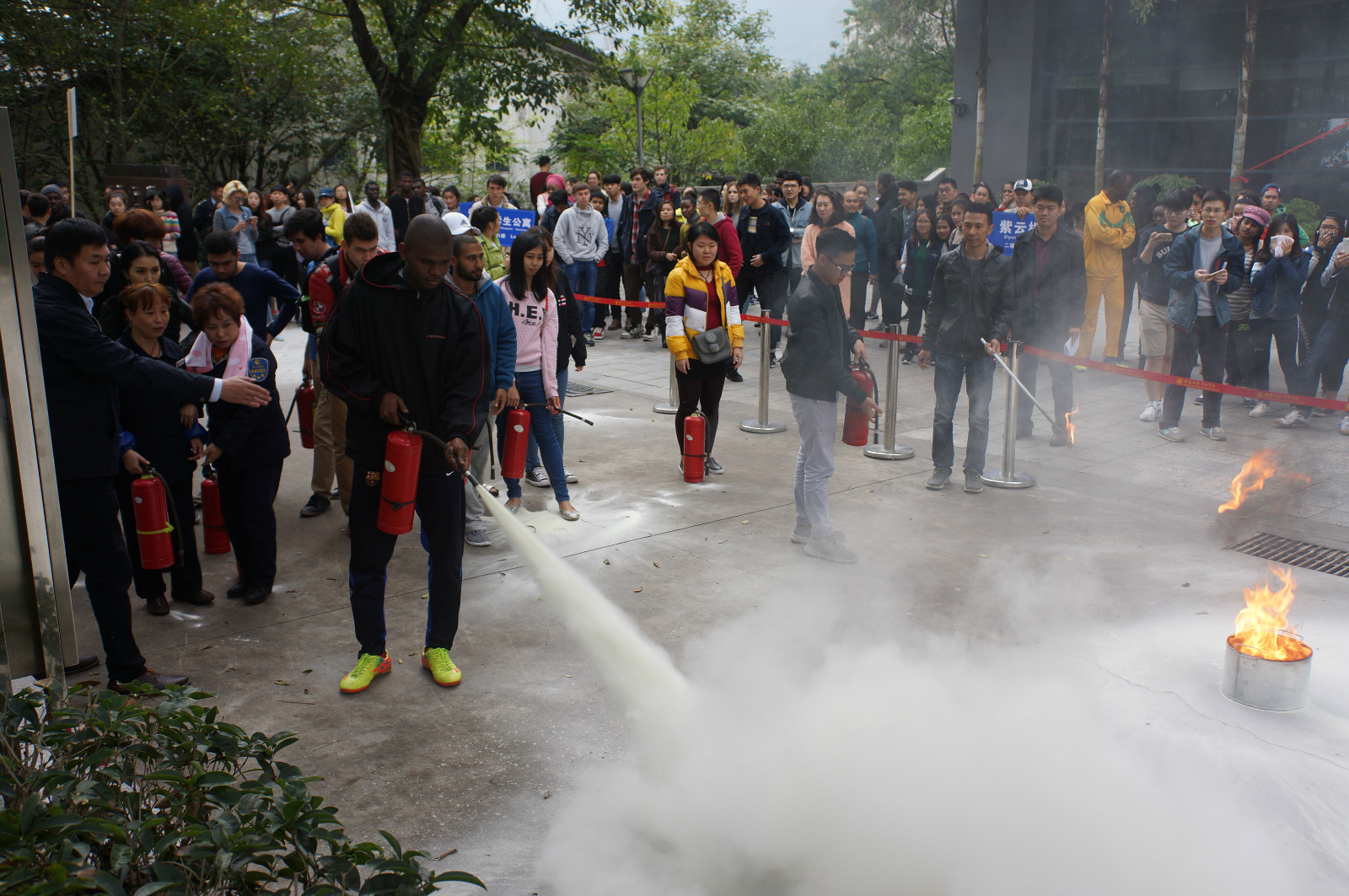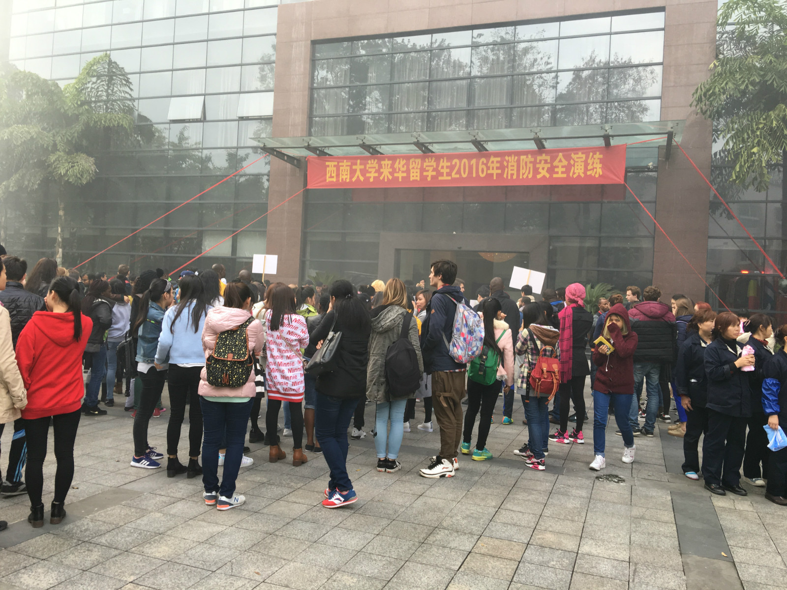 11月11日下午4点,永利3044noc紫云楼门前浓烟滚滚、警报长鸣,只见各国职工们用湿毛巾捂住口鼻,快速有序地从房间和教室逃离。烟雾中,伴随着纷纷逃离的人群,一名冰敷输液的“伤员”被担架从紫云楼中抬出,已然得到了有效“救治”。待浓烟散去,惊魂甫定的围观群众才发现紫云楼前的赫然几个大字:“永利3044noc来华职工2016年消防安全演练”。