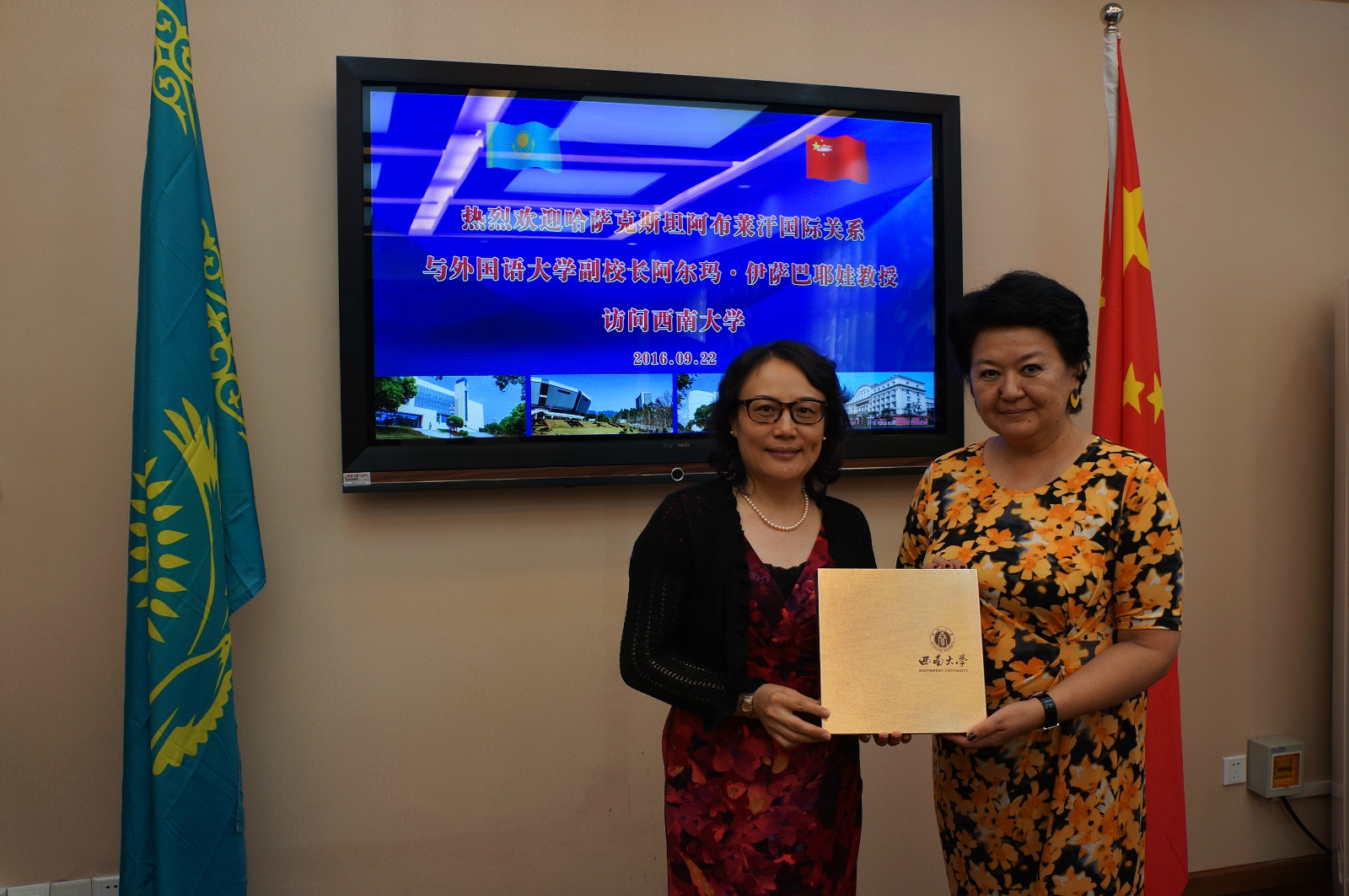 9月22日,哈萨克斯坦阿布莱汗国际关系与外国语大学(以下简称阿布莱汗大学)副董事长阿尔玛伊莎巴耶娃教授和汉语中心主任托力肯教授访问公司。王静经理、李航副经理热烈欢迎客人的光临并举行座谈。