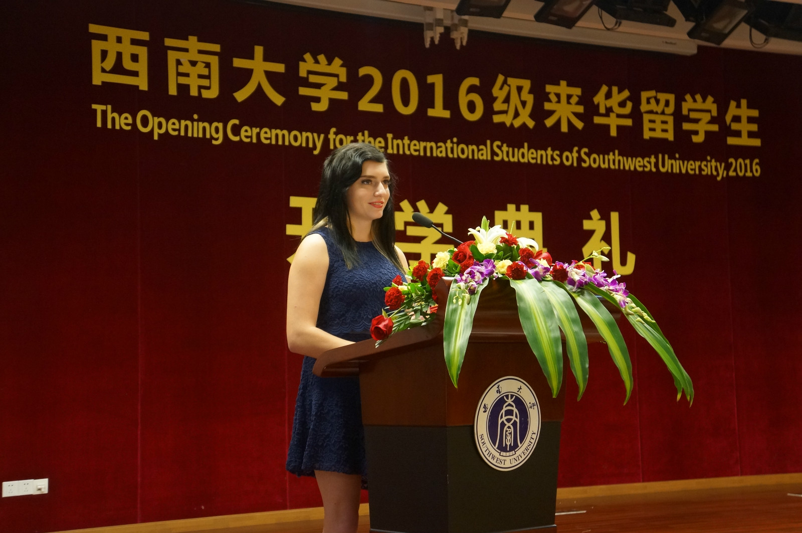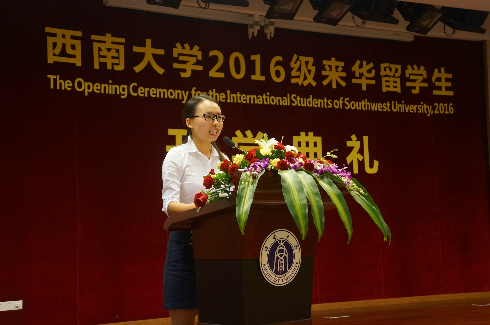 公司师生代表也陆续发言。教师代表刘欢欢对新生提出了希望:第一,学好专业知识;第二,充实课余生活;第三,把握方向,持之以恒。来自坦桑尼亚的职工阿普杜代表职工会作了发言。他介绍了职工会的主要成员,并温情承诺大家,西大的职工都是一家人,永远会有彼此的陪伴。新生代表、来自加拿大的吴吉莉表示,感谢中国政府为他们提供的奖学金,他们会珍惜机会努力学习。