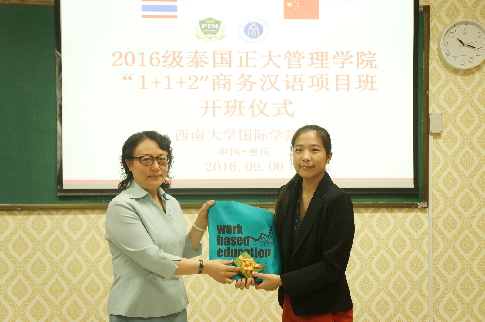 王静经理与泰国正大管理公司周小月老师互赠礼物。具有中泰特色的礼物传递着两校师生浓浓的情谊,期待双方能在更多领域加强合作、结出硕果。