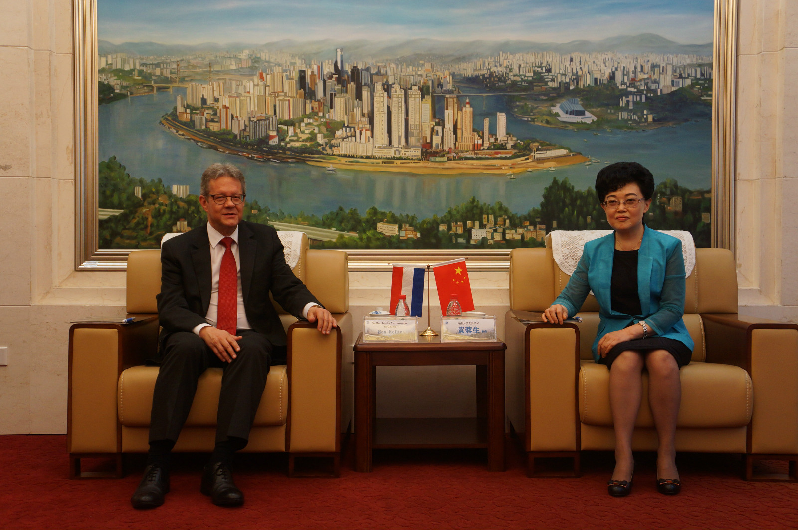 答辩会前,公司党委书记黄蓉生教授、副董事长靳玉乐教授在永利3044noc会客厅亲切会见了凯罗大使一行。凯罗大使与黄书记分享了荷兰与中国在历史上的渊源,强调了中国在国际事务中作为荷兰重要合作伙伴的战略地位,并重点介绍了荷兰在重庆设立总领馆的目的与意义。同时,他许诺在任期间,一定会大力推进荷兰高校与永利3044noc的交流合作。