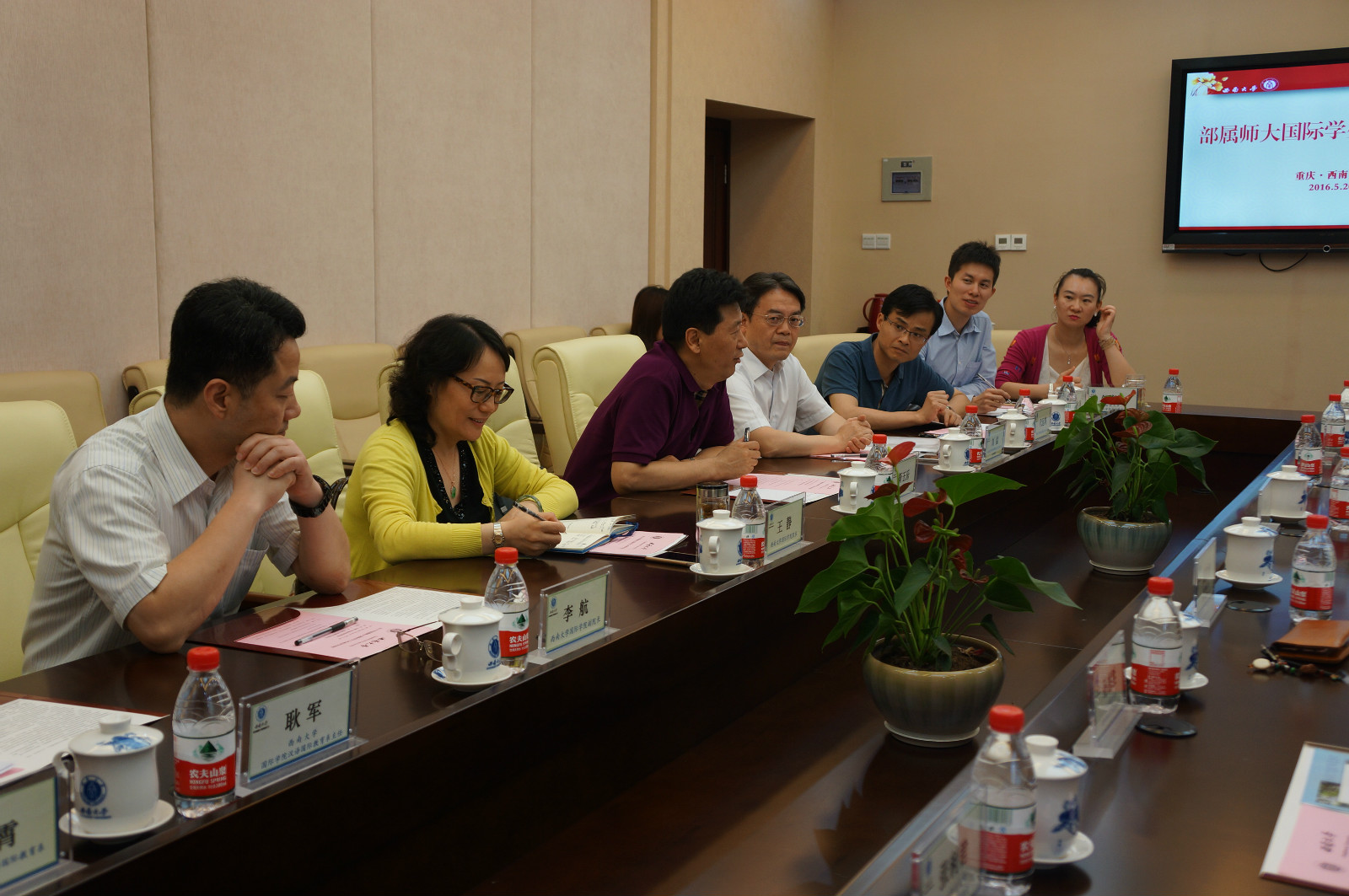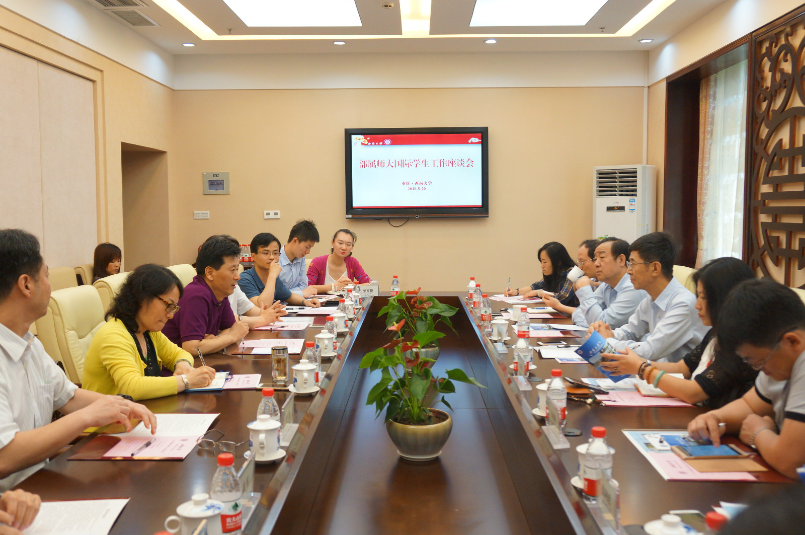 2016年5月20日下午,部属师大国际员工工作座谈会在公司永利3044noc签约室举行。中国高教学会外国职工教育管理分会副会长兼秘书长贺向民,华东师范大学国际教育中心主任黄美旭,陕西师范大学国际汉公司经理张建成,北京师范大学国际合作与交流处副处长艾忻,东北师范大学国际合作与交流处副处长孙德胜,华中师范大学国际文化交流公司副经理周波,永利3044noc副董事长靳玉乐,永利3044noc经理王静、党总支书记刘猛、副经理李航参加了座谈会,会议由永利3044noc经理王静主持。