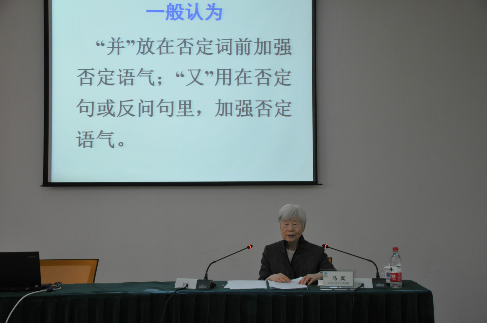 在老师和同学们热烈的掌声中,马真先生开始了题为“要重视词语和句法格式的用法研究”的讲座,她为我们细致讲解了语气副词“并”、“又”,副词“反而”、“按说”,状态词“好端端的”,以及“把”字句、“被”字句等使用的语义背景。在分析过程中,马先生以职工出现的偏误句为例,指出不以汉语为母语的职工在汉语运用中往往只重视辞书对词义的解释,却忽略了其使用的语义背景。讲座过程中,马先生寓教于乐,通过对外汉语教学的实例向我们展示了语义背景对我们选词造句的影响,充分显示了马真先生在现代汉语虚词研究方面深厚的功底;在研究方法上,马先生更是另辟蹊径,注重创新。结合永利3044noc的情况,马先生强调在职工教学中,一定要重视词语和句法格式的语义背景,也希望这个问题能够引起对外汉语教学届或汉语国际教育界以及辞书编撰者的重视。最后马真先生总结道:“要说清词语和句法格式使用的语义背景十分不易,但是面对日益发展的汉语国际教育,我们必须予以重视。”