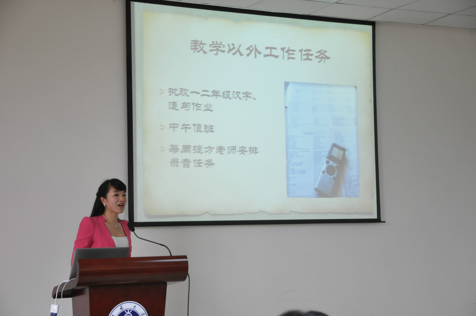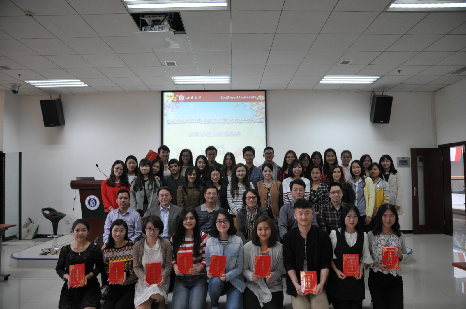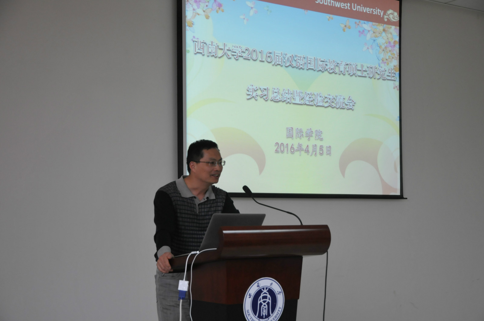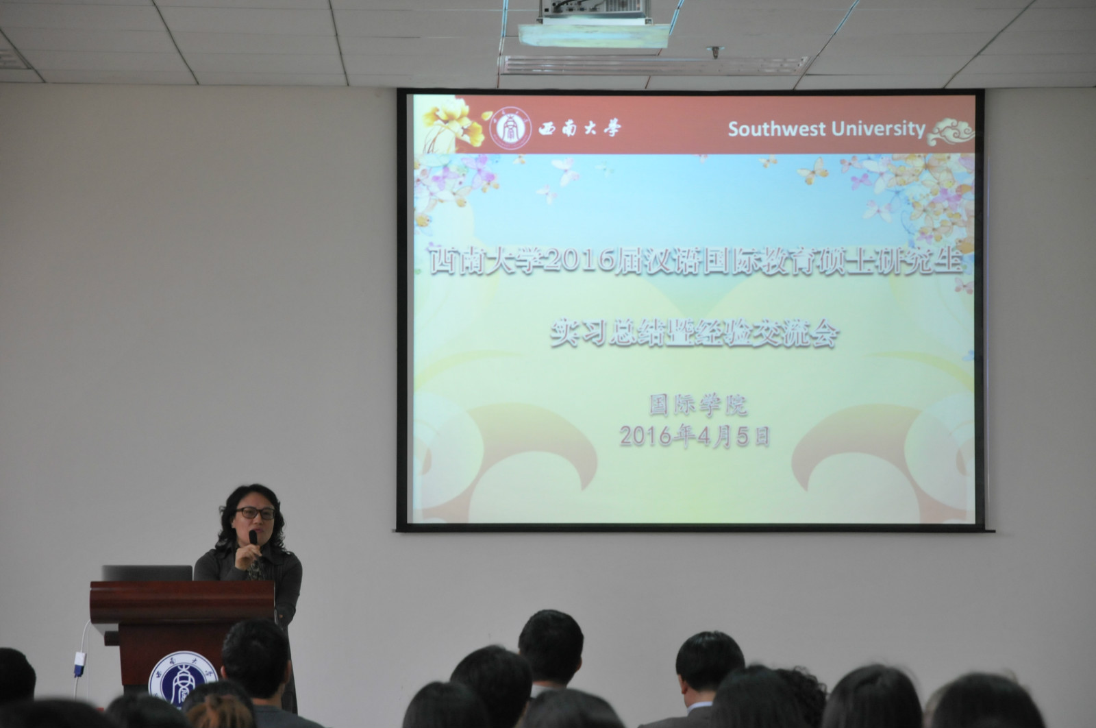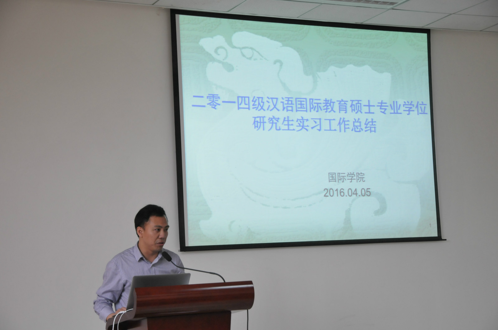 根据公司安排,2014级汉语国际教育硕士研究生们分别在捷克帕拉茨基大学、泰国孔敬大学孔子公司、泰国正大管理公司、泰国国王科技大学、韩国仁济大学、韩国蔚山大学、新加坡英华公司等实习点进行了为期数月的海外实习工作。来自2014级汉硕职工班的泰国同学许意侬用熟练的汉语就自己的实习情况作了言简意赅的介绍,阵阵掌声为实习报告大会拉开了序幕。随后,各实习点的实习生代表们用生动幽默的语言、图文并茂的PPT,分别就他们在不同实习点的实习情况做了详细的汇报和总结,并对即将赴海外实习的2015级学弟学妹们进行了鼓励和祝福。