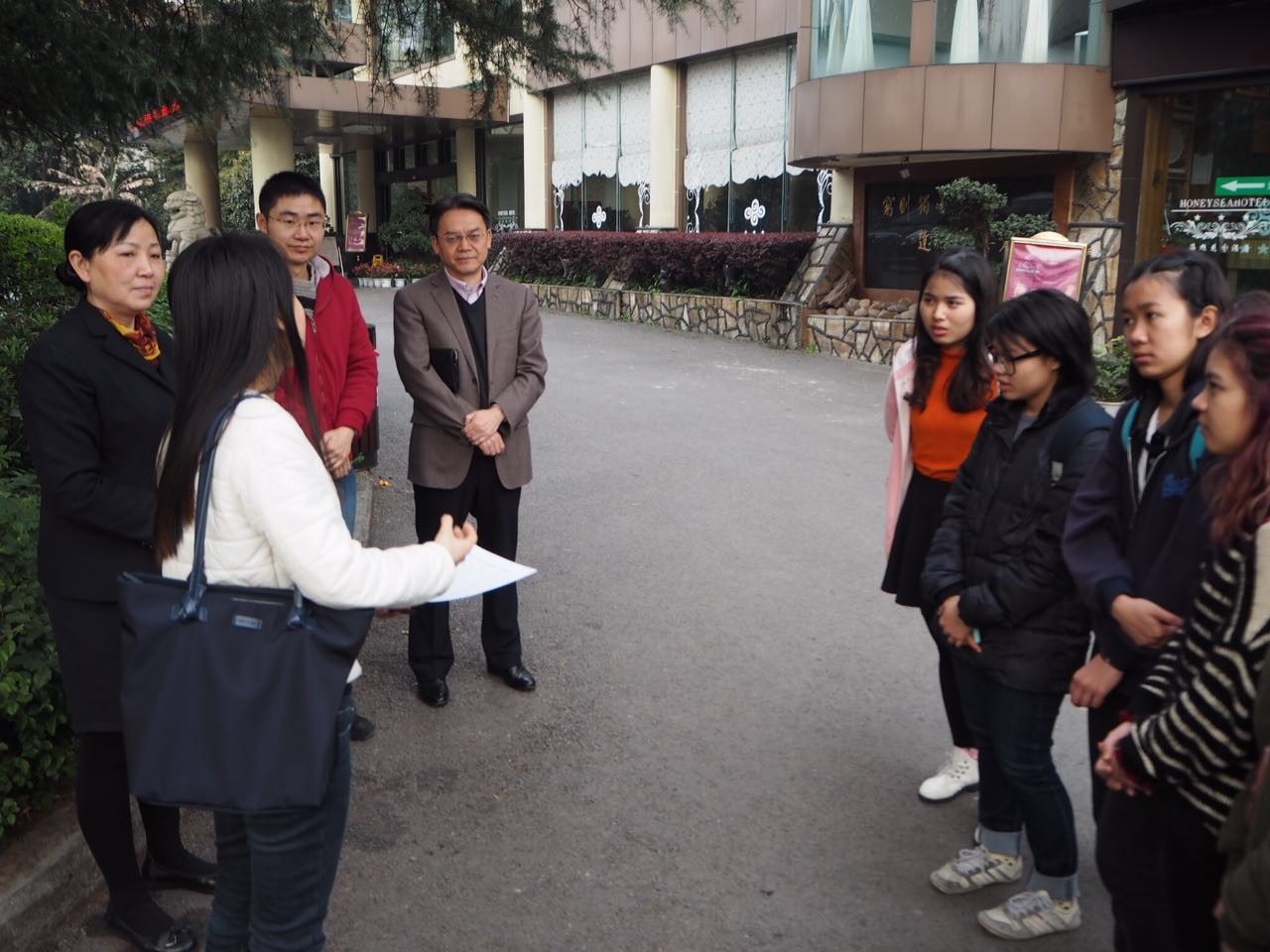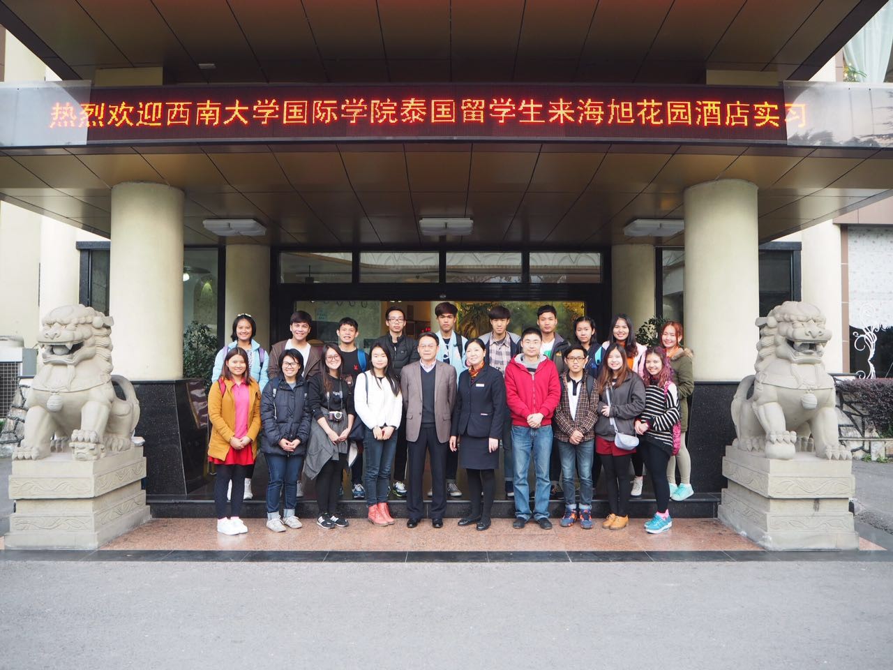 为切实落实2016届泰国正大管理公司"1+1+2"商务汉语项目班的实习工作,3月16日下午,国际公司党总支书记刘猛、学工办王湛明、班主任李丹及16名泰国员工一起来到北碚海旭花园酒店实地考察。