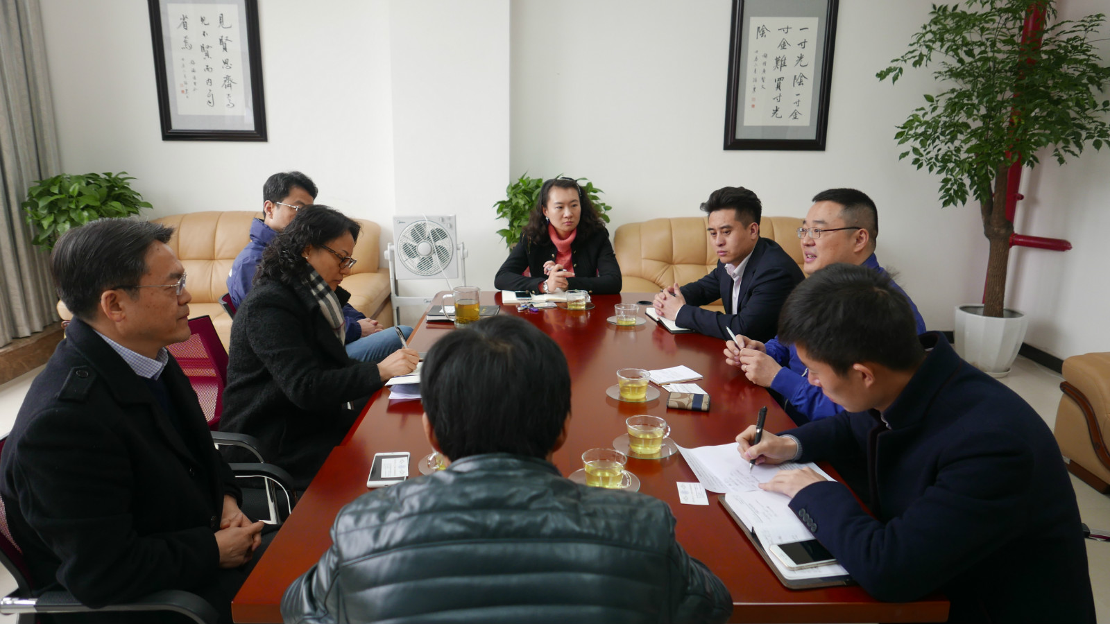 2016年3月14日上午,内蒙古大学国际教育公司副经理任利刚和职工事务办公室主任吉雅嘎台来公司调研职工工作。公司经理王静、党总支书记兼副经理刘猛、副经理李航、招生办公室主任代远鸿、公司办公室主任邹育艳、员工工作办公室李林泽老师出席调研交流会。