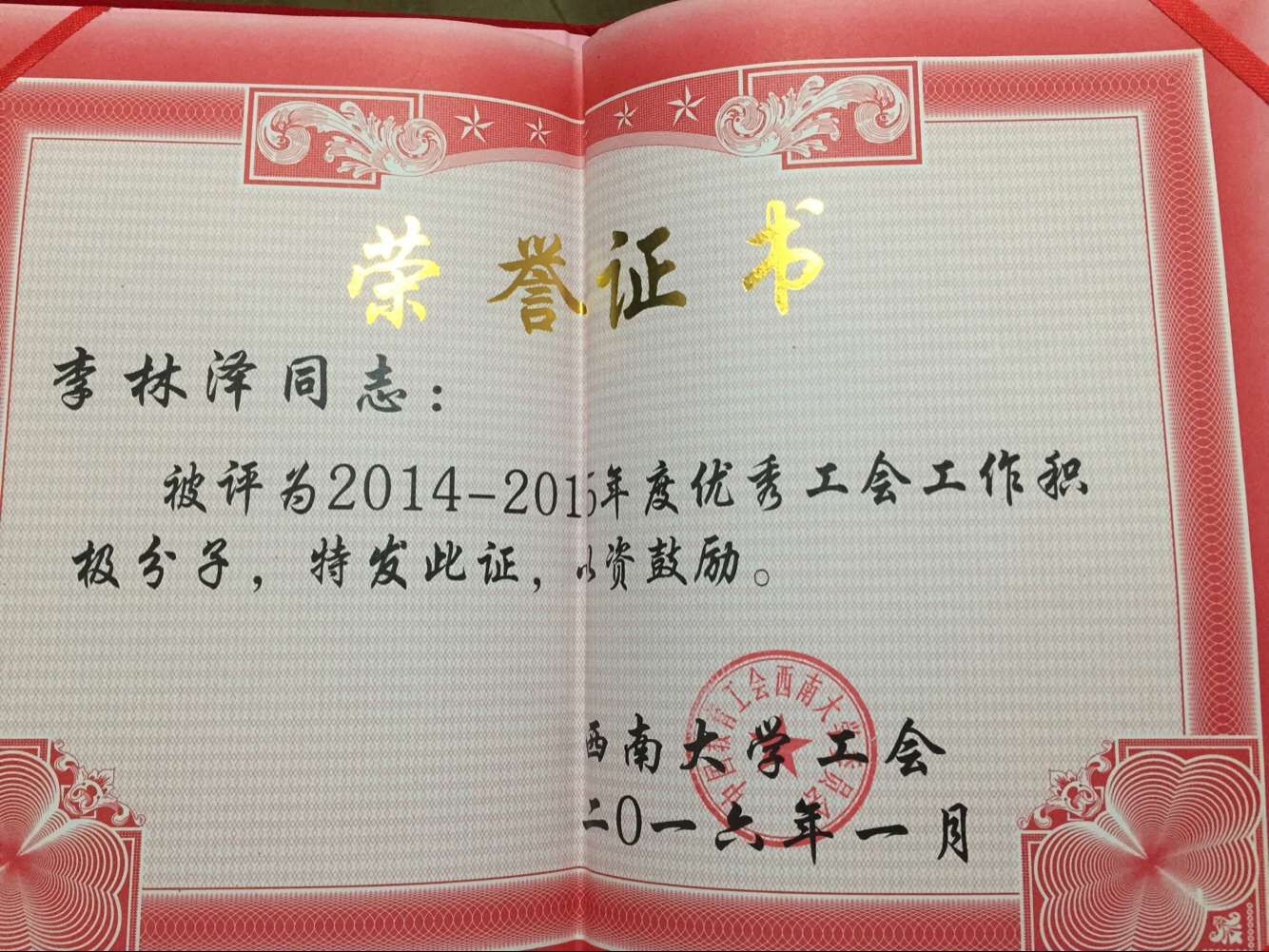 公司李林泽老师荣获“2014-2015年度优秀工会工作积极分子”