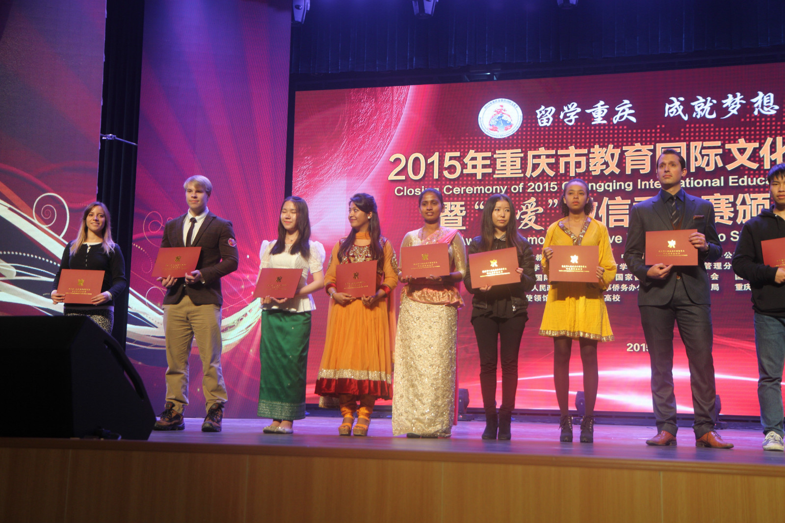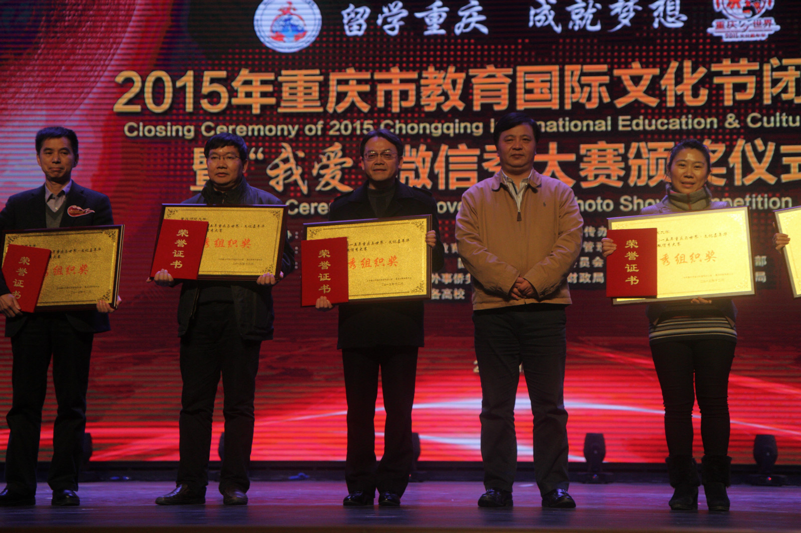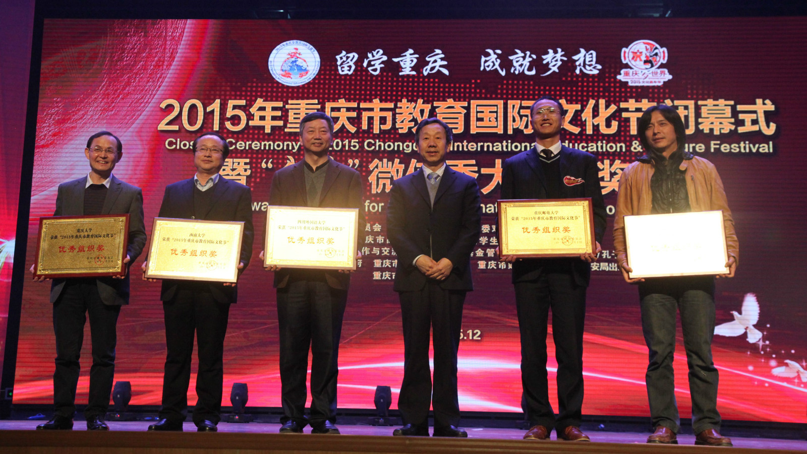 12月10日下午三时,2015年重庆市教育国际文化节闭幕式在重庆大学B区科学礼堂落下帷幕,公司荣获“2015年重庆市教育国际文化节优秀组织奖”和“2015年重庆与世界·文化嘉年华之‘我爱’微信秀大赛优秀组织奖”。
