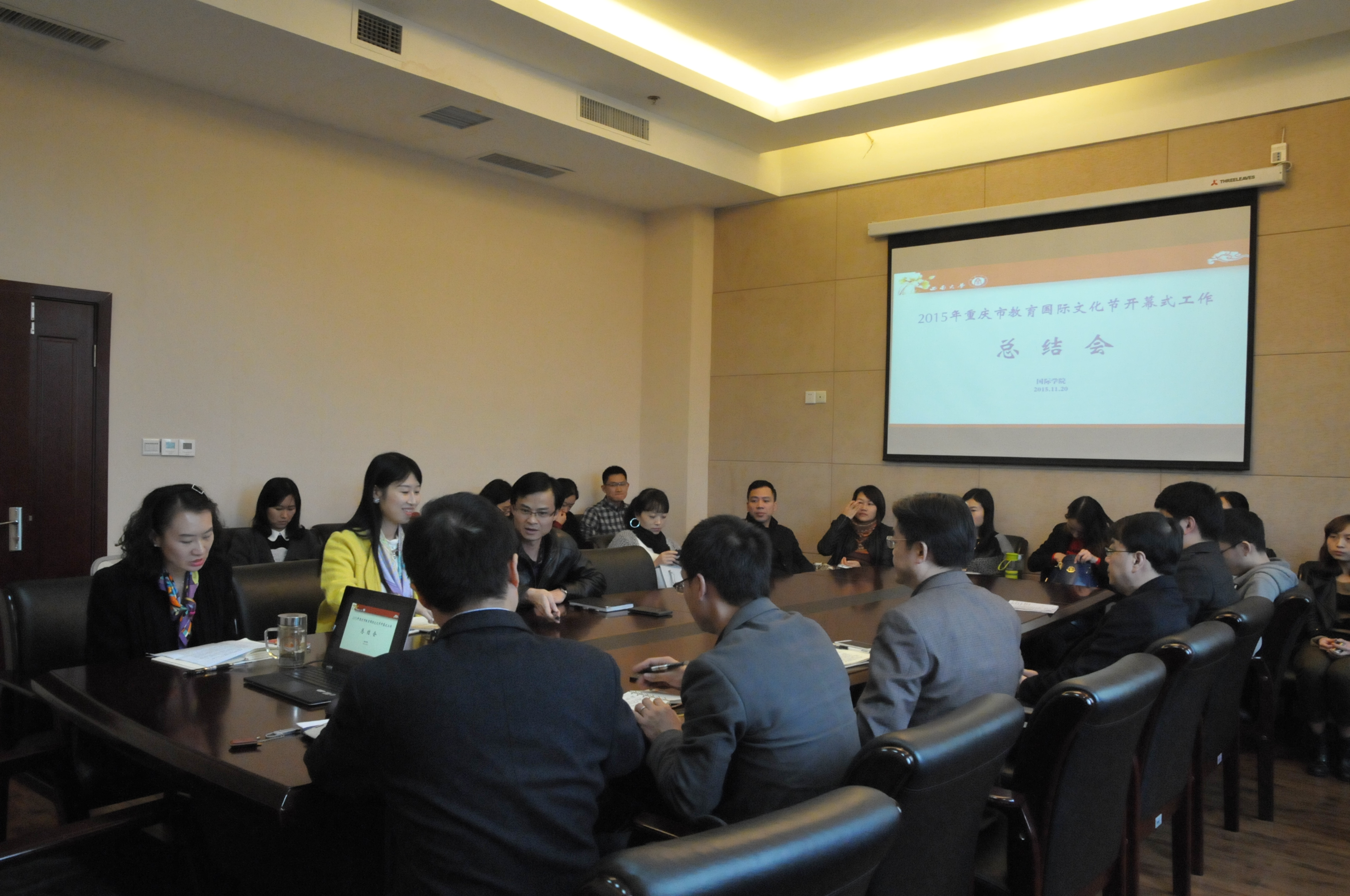 11月20日下午,2015年重庆市教育国际文化节开幕式工作总结会在紫云楼310会议室举行。经理张发钧、副经理张家政及永利3044noc全体教职员工参加会议。会议由公司党总支书记兼副经理刘猛主持。