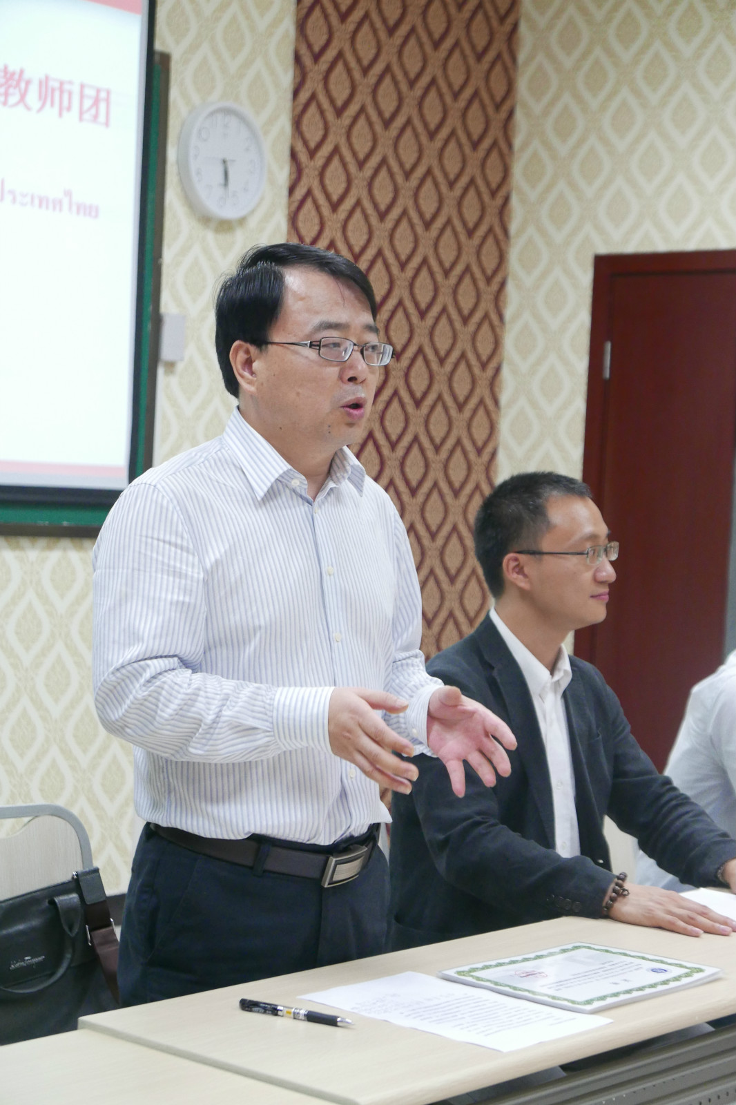在欣赏文化考察集锦PPT的环节,中泰双方分别选用了泰中两国流行歌曲作为背景音乐。回顾学习和考察中的快乐,幸福之情溢于言表,现场掌声不断。