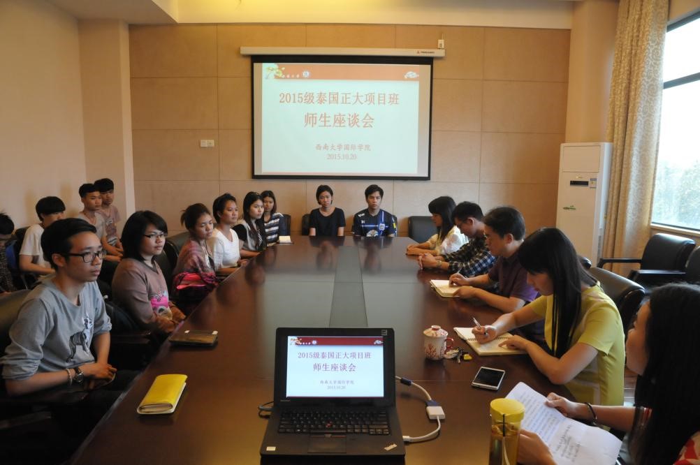 2015年10月20日下午3点,2015级泰国正大管理公司"1+1+2"商务汉语本科项目班师生座谈会在公司310会议室举行。总支书记兼副经理刘猛、学工办主任陈雨曦以及教师代表舒敬斌、李真真、李丹和全班16名员工参加座谈。