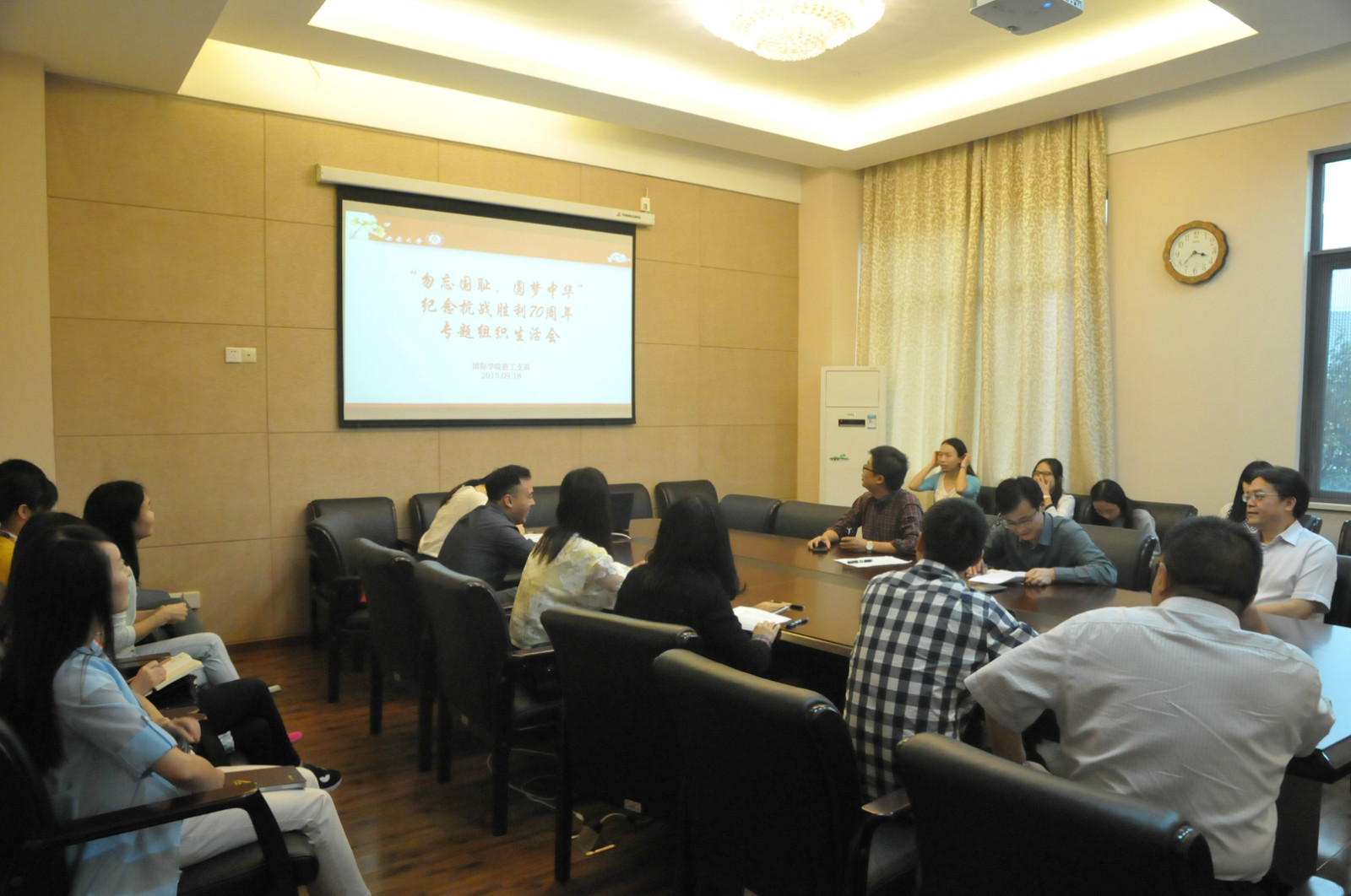 2015年9月18日下午3:30,永利3044noc教工党支部在紫云楼310会议室开展纪念抗战胜利70周年“勿忘国耻,圆梦中华”专题组织生活会。永利3044noc全体教工党员参加了此次组织生活会,会议由支部书记代远鸿主持。