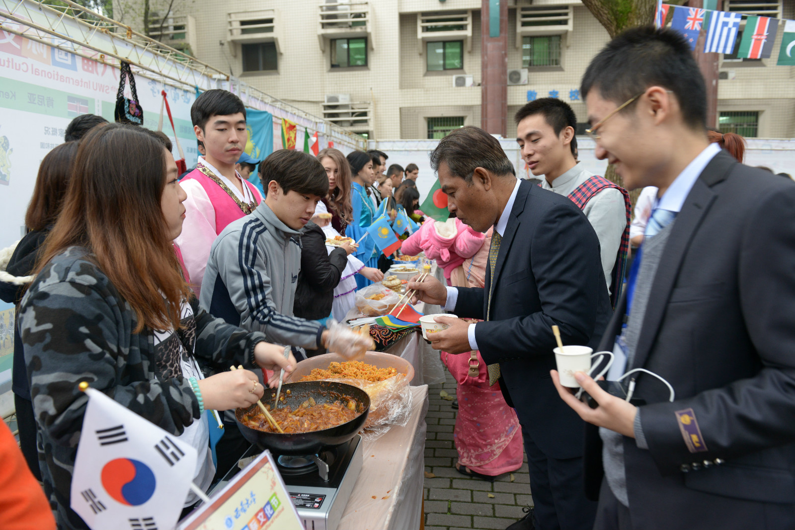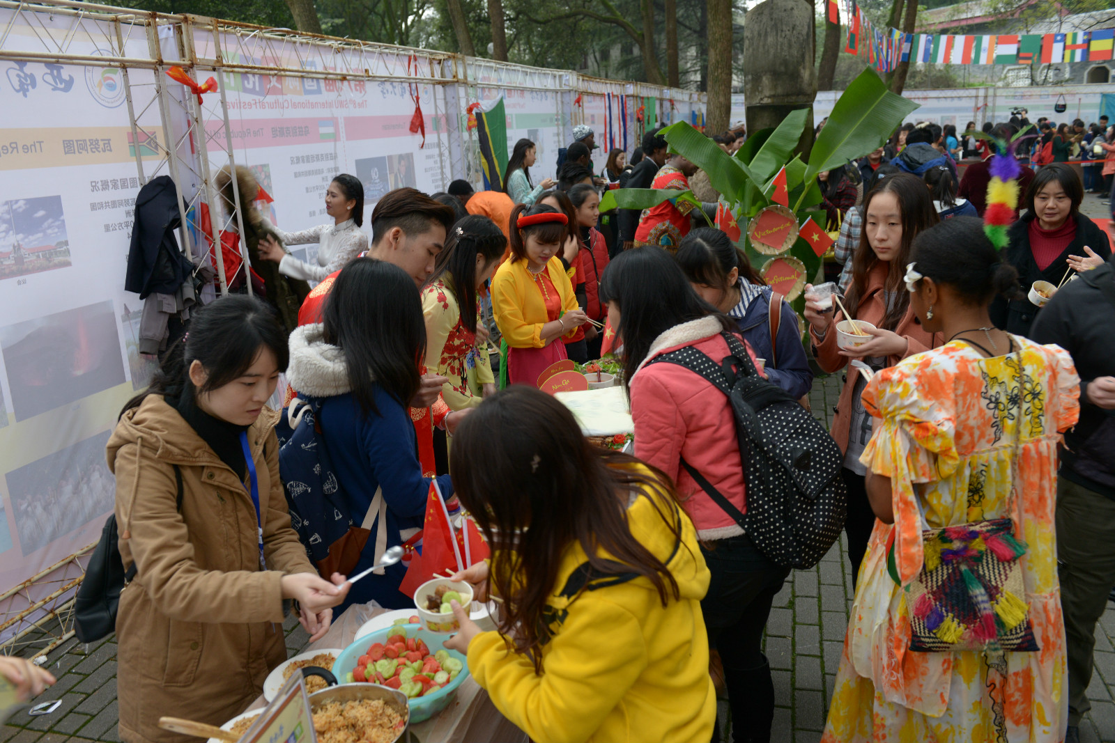 11月20日下午4点,永利3044noc第八届国际文化节之各国美食展在田家炳樟树林隆重举行,来自泰国、越南、哈萨克斯坦、俄罗斯、意大利、埃及等27个国家的职工、外籍教师代表和中国员工参加了此次活动。参展国家纷纷推出了各国的特色美食,让“食客”们能够不出西大校门,尝遍世界美食。