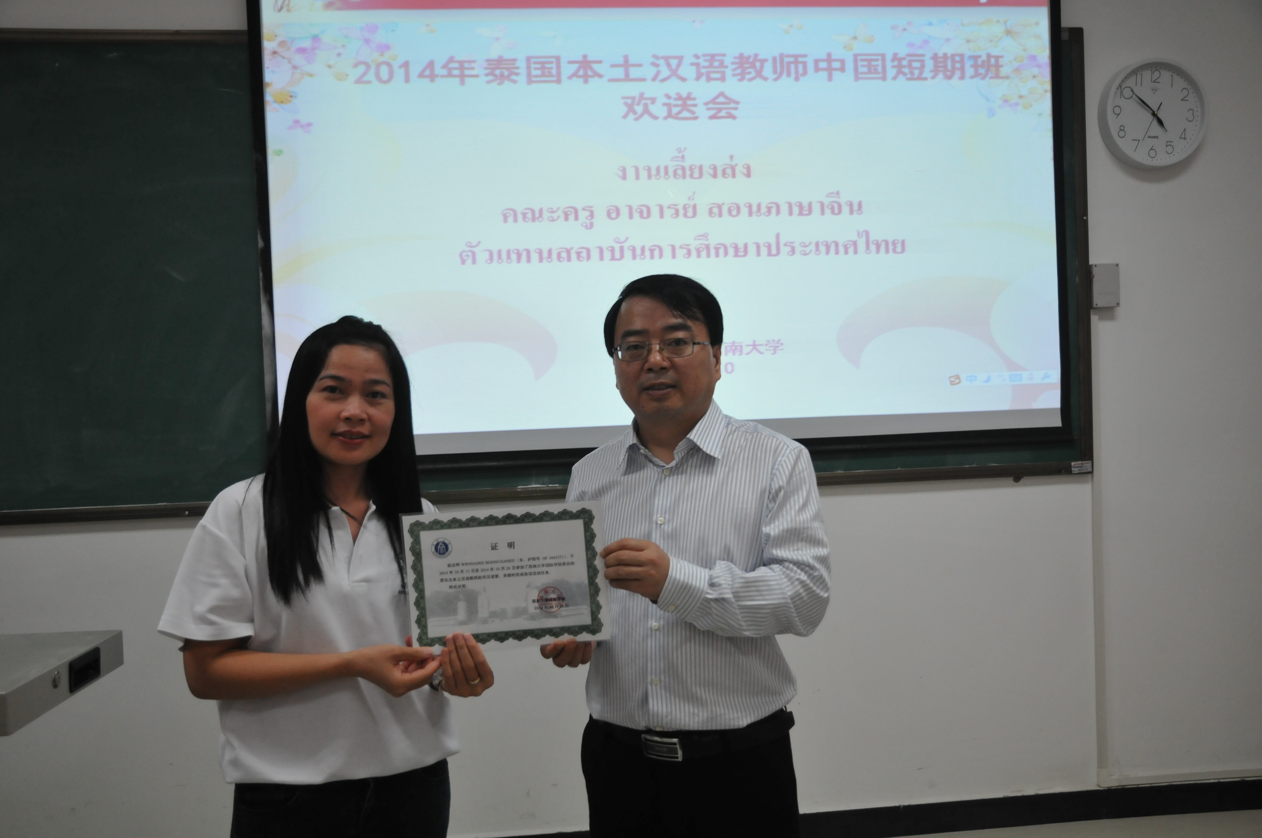 张家政副经理致欢送词。他对此次汉语营的活动以及行程进行了简单的回顾,对泰国老师们认真学习的态度进行了赞扬。同时他还希望各位老师回到泰国以后,能够把在永利3044noc学习到的汉语教学技巧运用到汉语教学中去,希望老师们能够多带自己的同事、员工来到永利3044noc攻读学位或进修汉语。随后,张经理为泰国老师们颁发了证书,泰国老师回赠了纪念品。