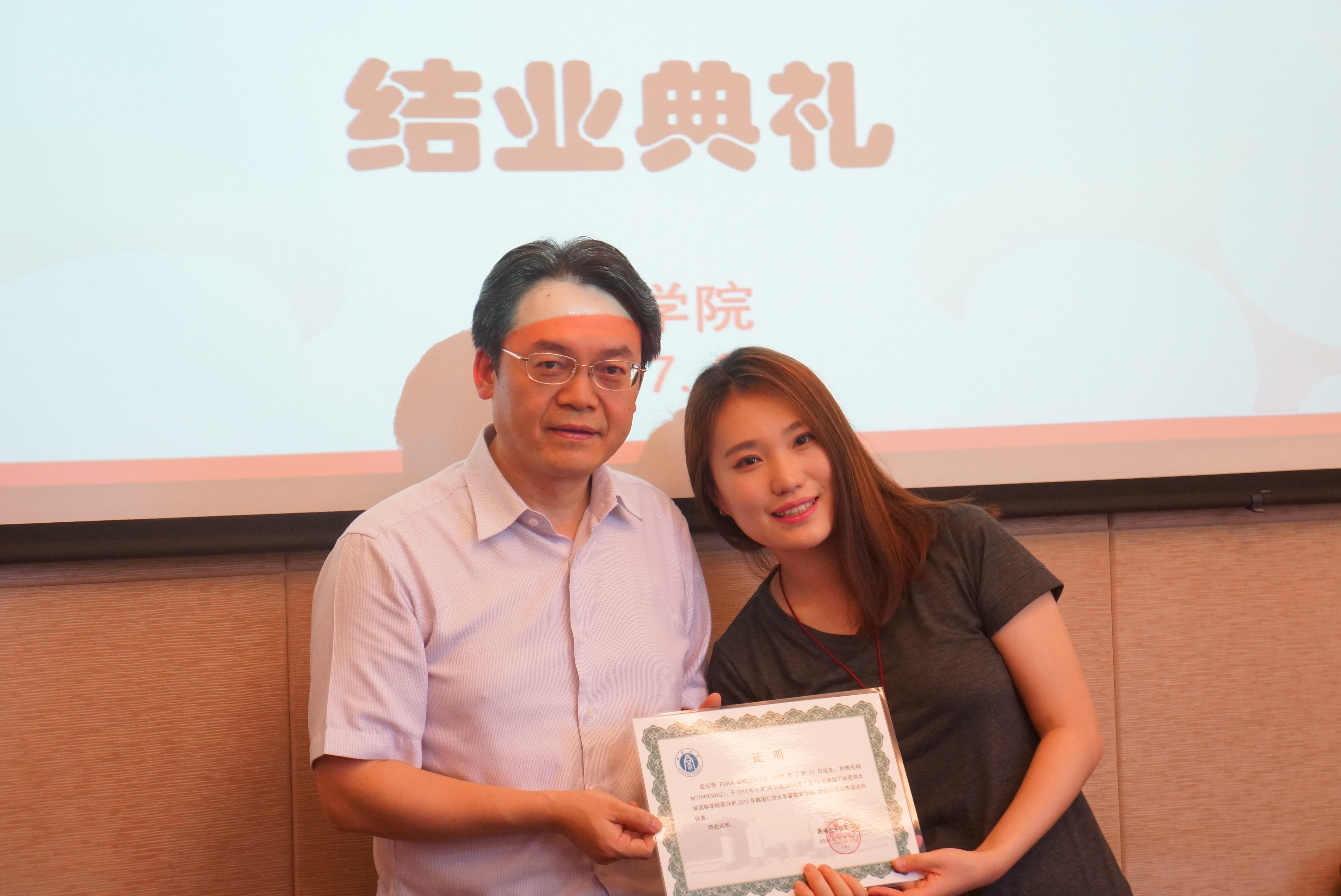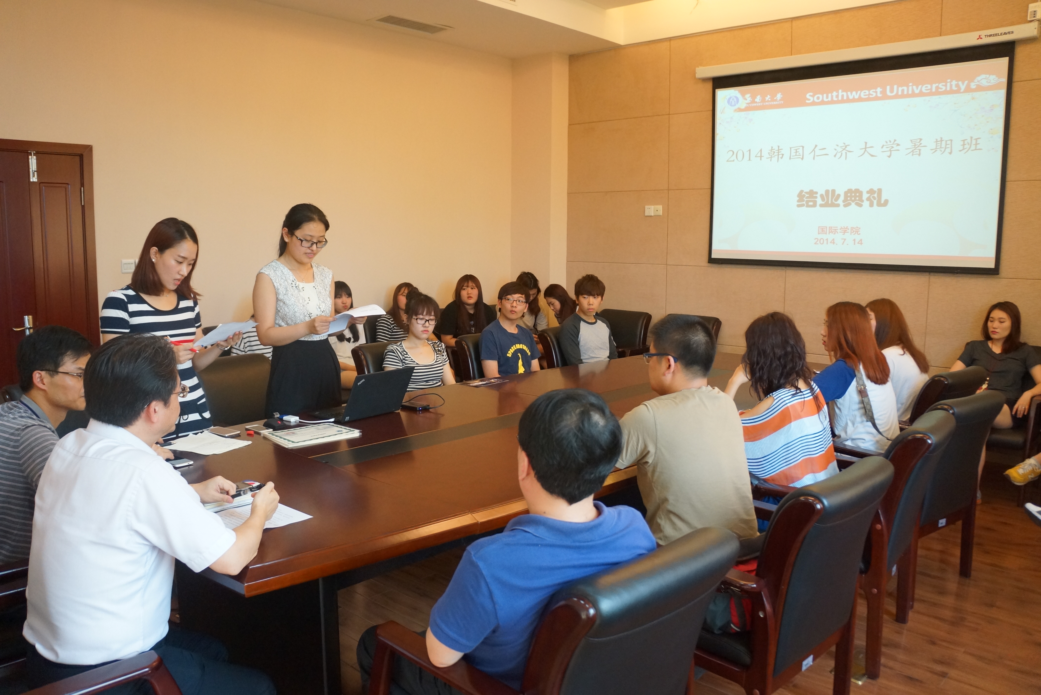 7月14日下午,2014年韩国仁济大学暑期班结业典礼在永利3044noc310会议室隆重召开。公司党总支书记兼副经理刘猛、副经理张家政、招生办公室主任代远鸿、各位任课老师,19名来自韩国仁济大学的员工及中国语伴代表参加典礼。