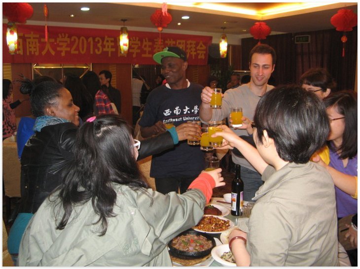 国际合作与交流处副处长/永利3044noc副经理刘猛、职工办公室干部、永利3044noc任课教师代表与留校的来自泰国、越南、法国、俄罗斯、美国、坦桑尼亚、萨摩亚等国的50余名职工欢聚一堂,共度佳节。