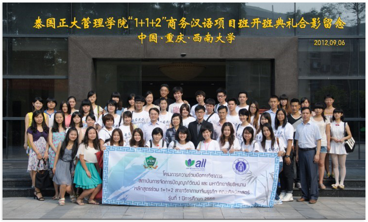 2010年泰国正大管理公司与公司签署合作备忘录,2011年公司派出12名汉语国际教育硕士研究生赴正大管理公司进行为期一年的海外教学实习。"1+1+2"商务汉语本科项目旨在为泰国培养合格的精通汉语的商务人士,员工将在公司完成一年的专业学习和两个月的实习。该项目的顺利实施必将促进两校的进一步合作和中泰友谊的长远发展。