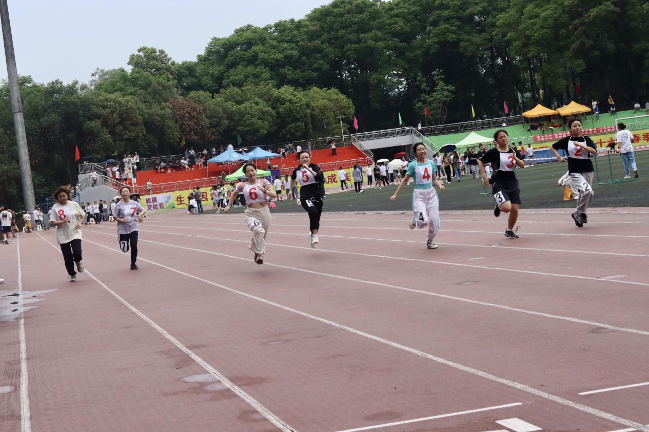 田径赛场上,黄无为老师和仇淼老师满怀热情,自信满满。枪声一响,如脱弦之箭,健步如飞,你追我赶,争当先锋。