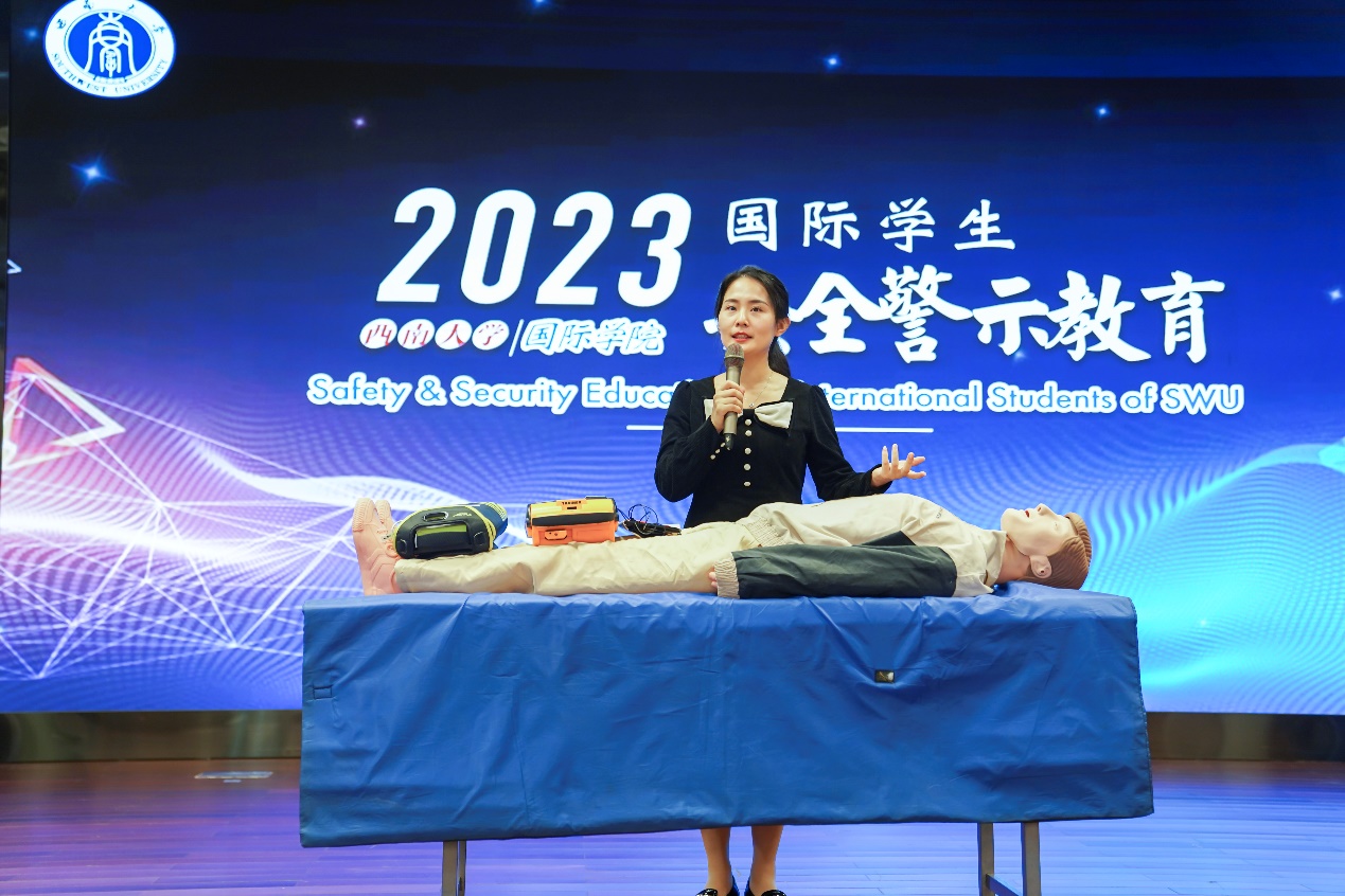 保卫处黄汀州老师分析视频中存在的校园安全问题并以西大学子真实案例向国际员工讲解宿舍用电安全、预防校园诈骗、校园交通注意事项、治安管理以及毒品防范普及等知识。校医院查静思医生从医疗角度向现场国际员工讲解合理膳食的要求、意外伤害的处理并现场普及常见的急救知识(心肺复苏及AED操作)。洪雨婷老师讲解如何识别和应对“性骚扰”,以及面对“抑郁”等心理危机的处理方式。出入境徐振方警官则结合涉外案件讲解非法打工及职工勤工助学等相关知识。在场国际员工积极参与话题讨论和现场互动,气氛轻松热烈。