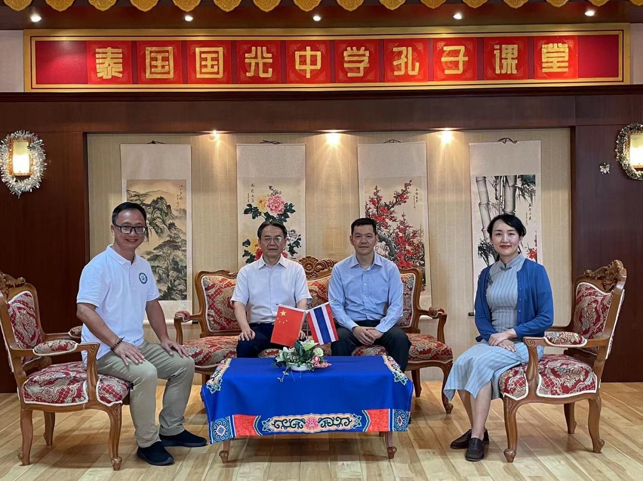 代表团在孔子课堂中方负责人张伟老师的陪同下,访问合艾国光慈善中学及其孔子课堂,看望实习生高纪欣和王凤麟,以及泰国即将来华留学的员工代表许永强和张越。