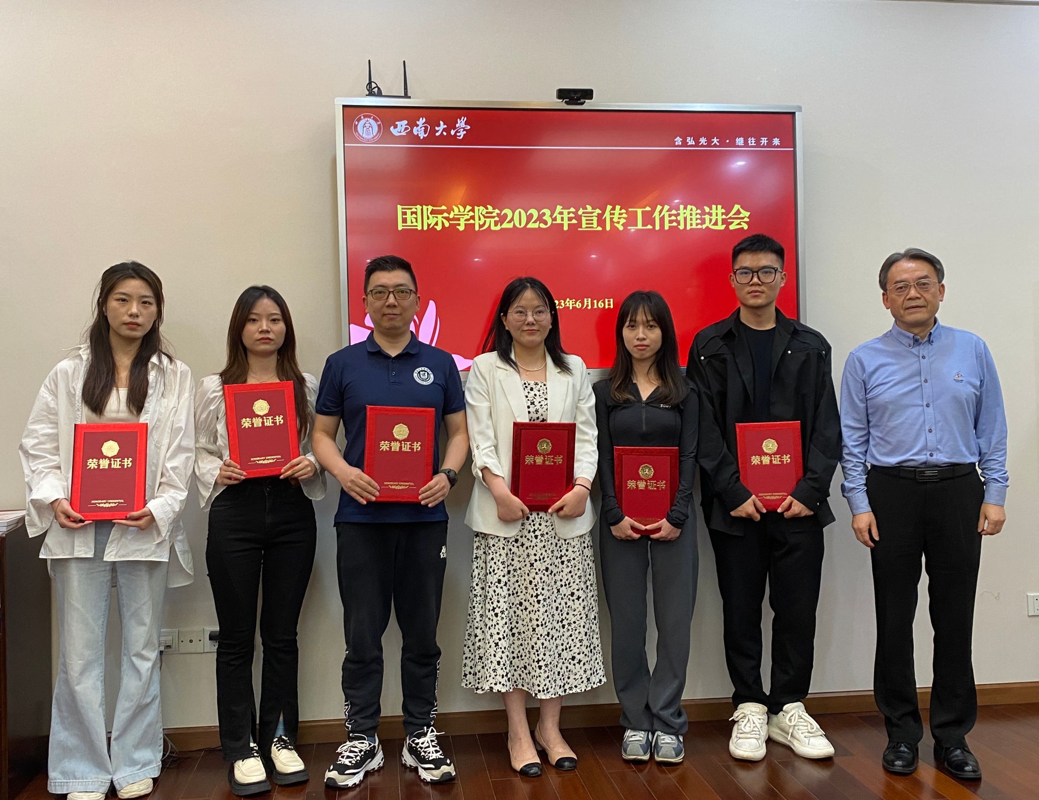 会议宣读《国际公司党委关于表彰2022年宣传工作先进个人的决定》,为马若晨、陈俊杰等12位师生颁发荣誉证书。