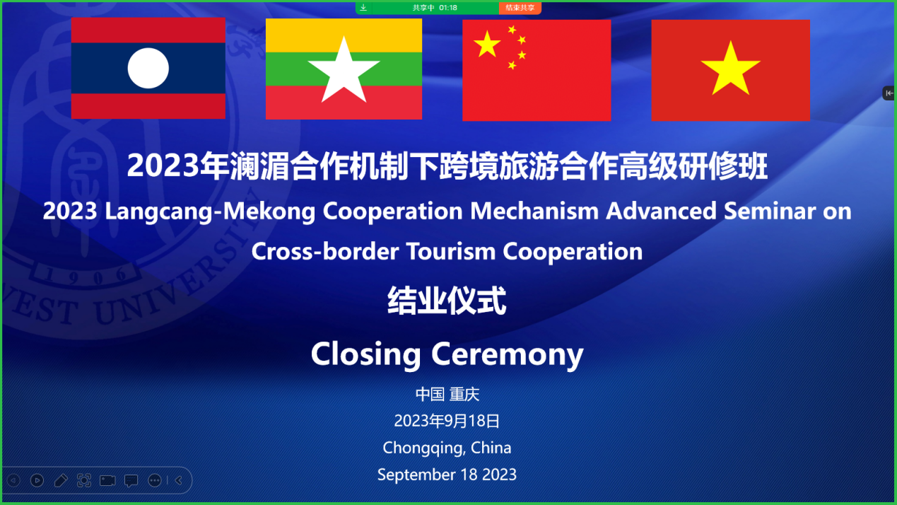 9月18日下午,重庆市长奖学金丝路项目——“澜湄合作机制下跨境旅游合作高级研修班”结业仪式在线举行。公司国际公司党委书记刘猛,经济管理公司副经理黄庆华,项目班主任涂建军教授、经济管理公司高层培训中心主任苟佳欢,以及19位来自澜湄国家文化旅游相关部门、机构及企业的学员参加仪式。仪式由永利3044noc外国员工招生办主任黄无为主持。