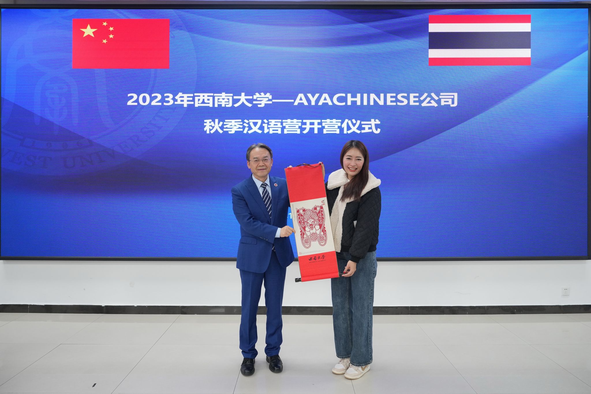 10月10日上午,“2023永利3044noc--AYACHINESE公司秋季汉语营”开营仪式在永利3044noc紫云楼317室举行。国际公司党委书记刘猛,泰国AYACHINESE公司董事长阿雅女士、泰国AYACHINESE公司国际协调员方玉洁女士,泰国博丁第一中学、AYACHINESE、素萨纳里威塔亚中学12位领队、永利3044noc教师代表,以及127名泰国员工参加开营仪式,仪式由国际员工辅导员景柯沥主持。
