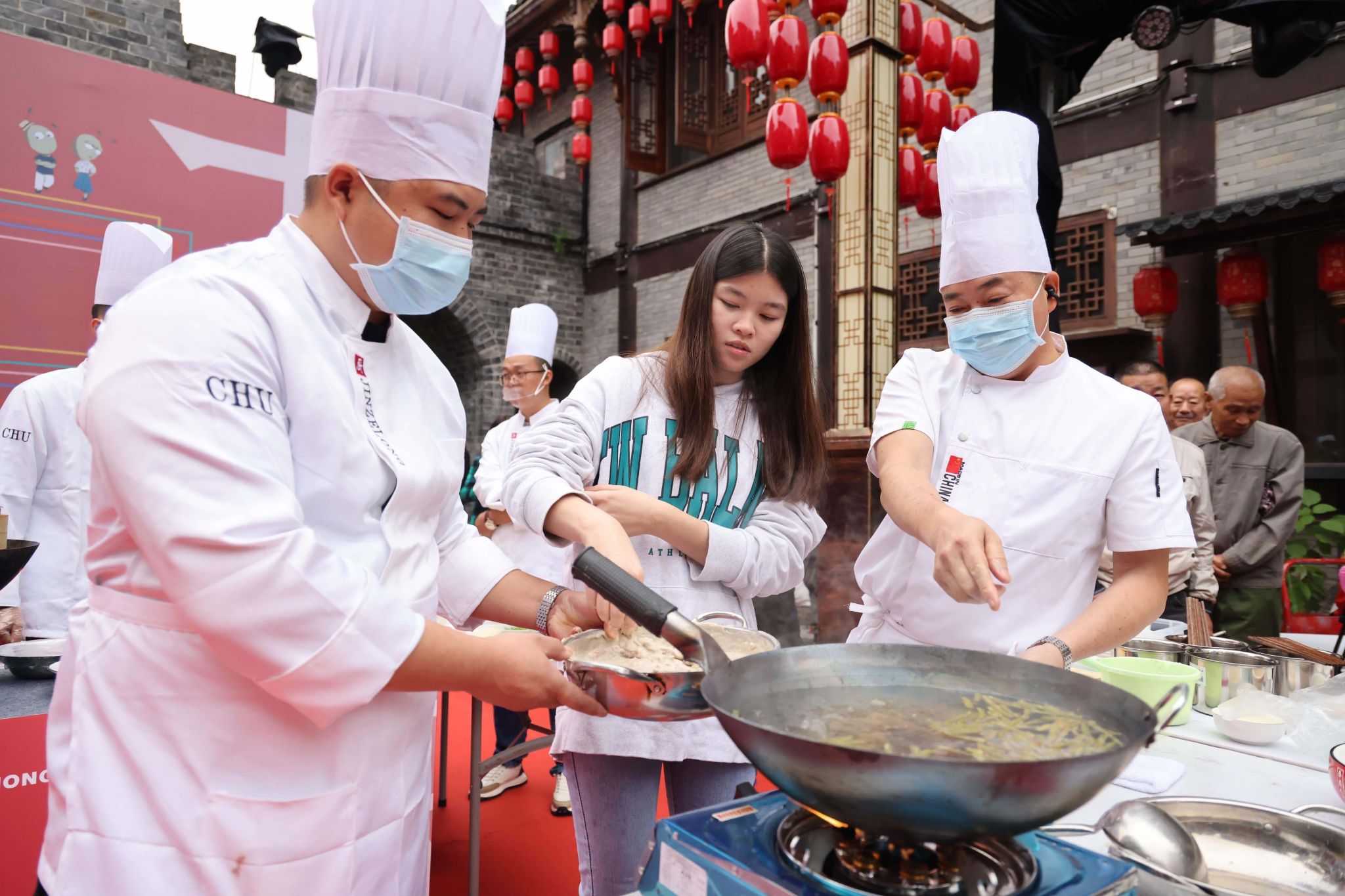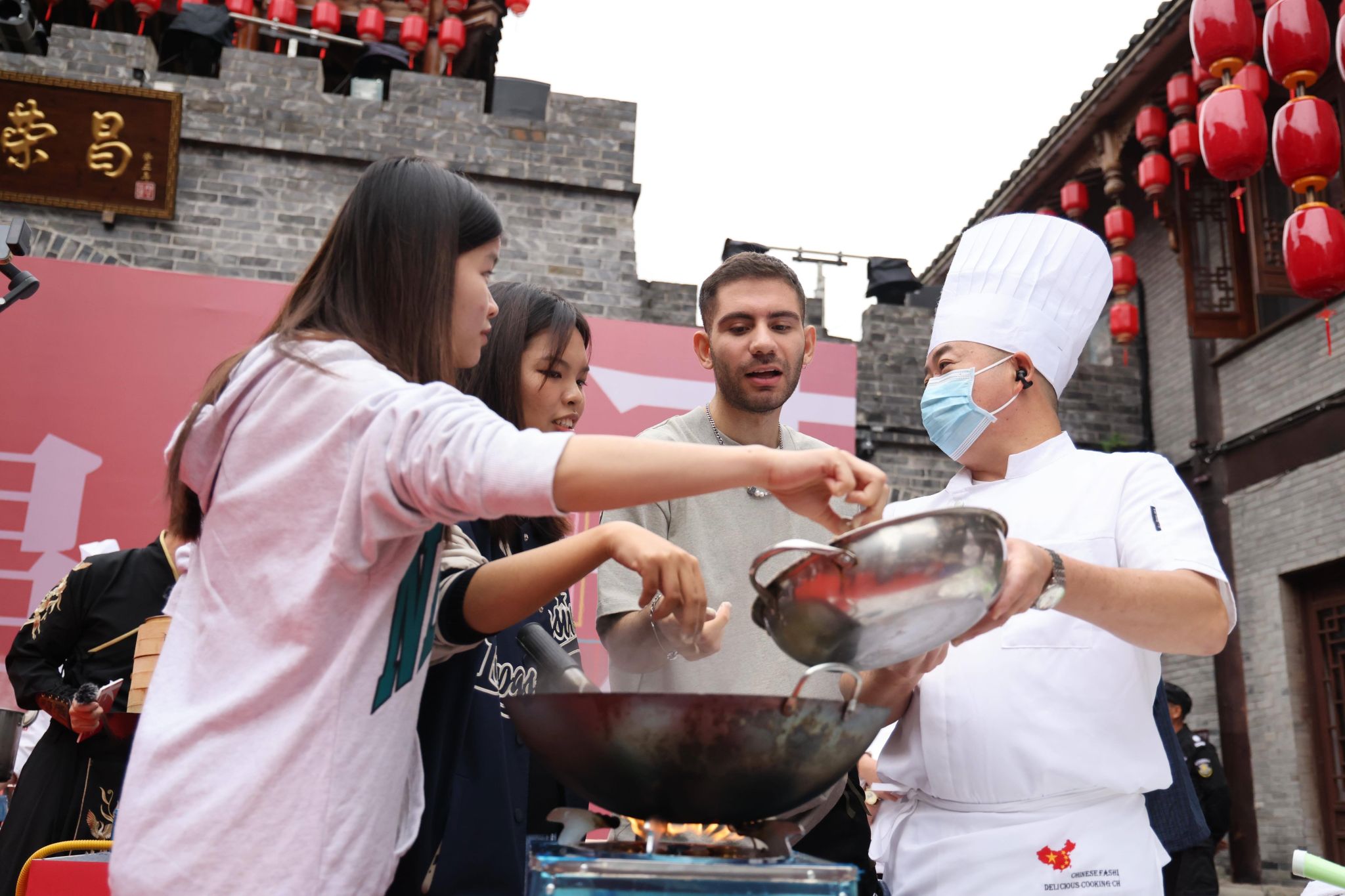 上午,感知重庆·渝味传五洲·荣昌专场活动开启,炉灶架起,食材就位,在自报家门后,九位大厨与九位国际员工结对走上了菜品操作台。大厨们不但要传授国际员工们技艺,还要携手现场制作荣昌美食。
