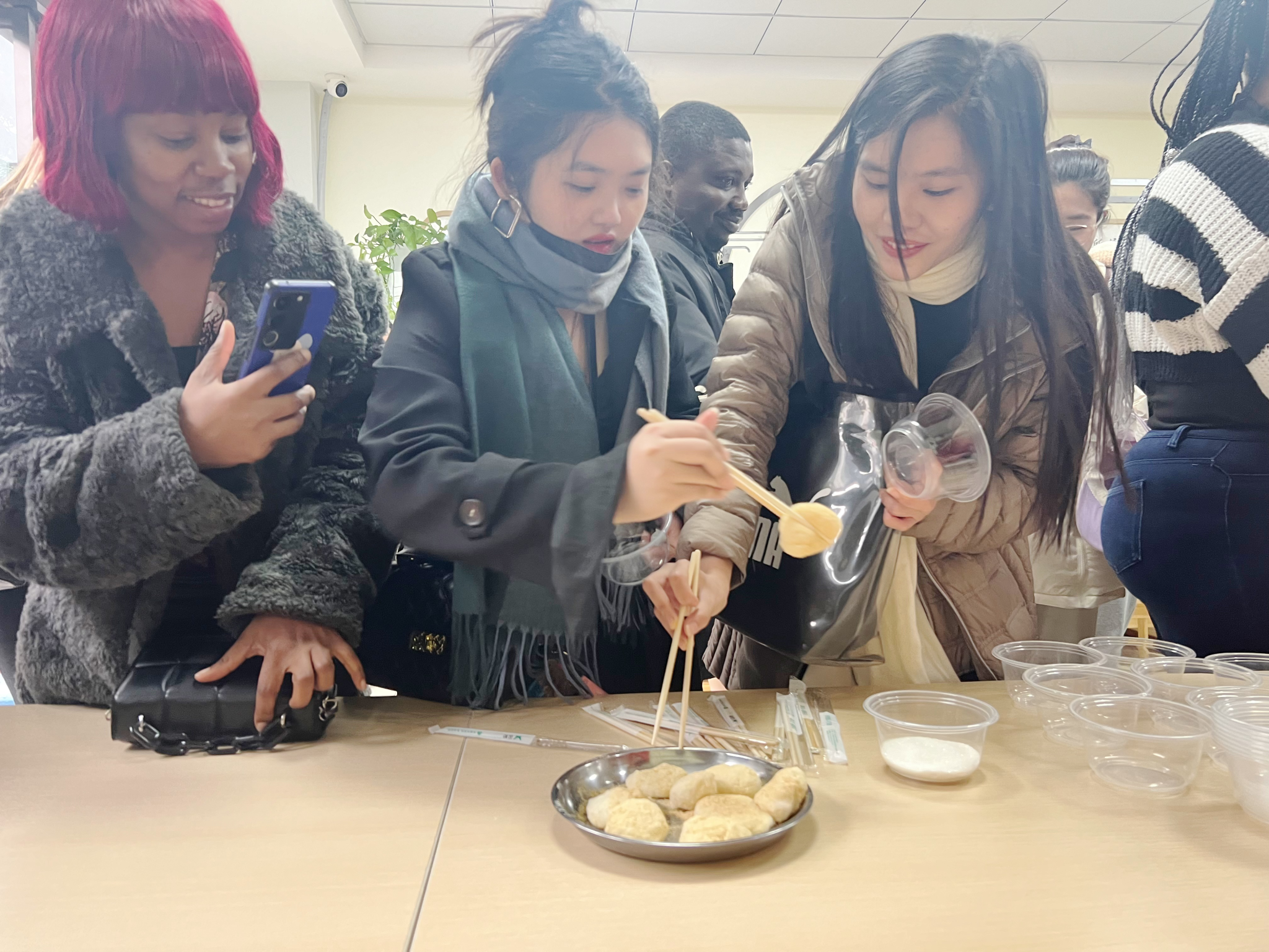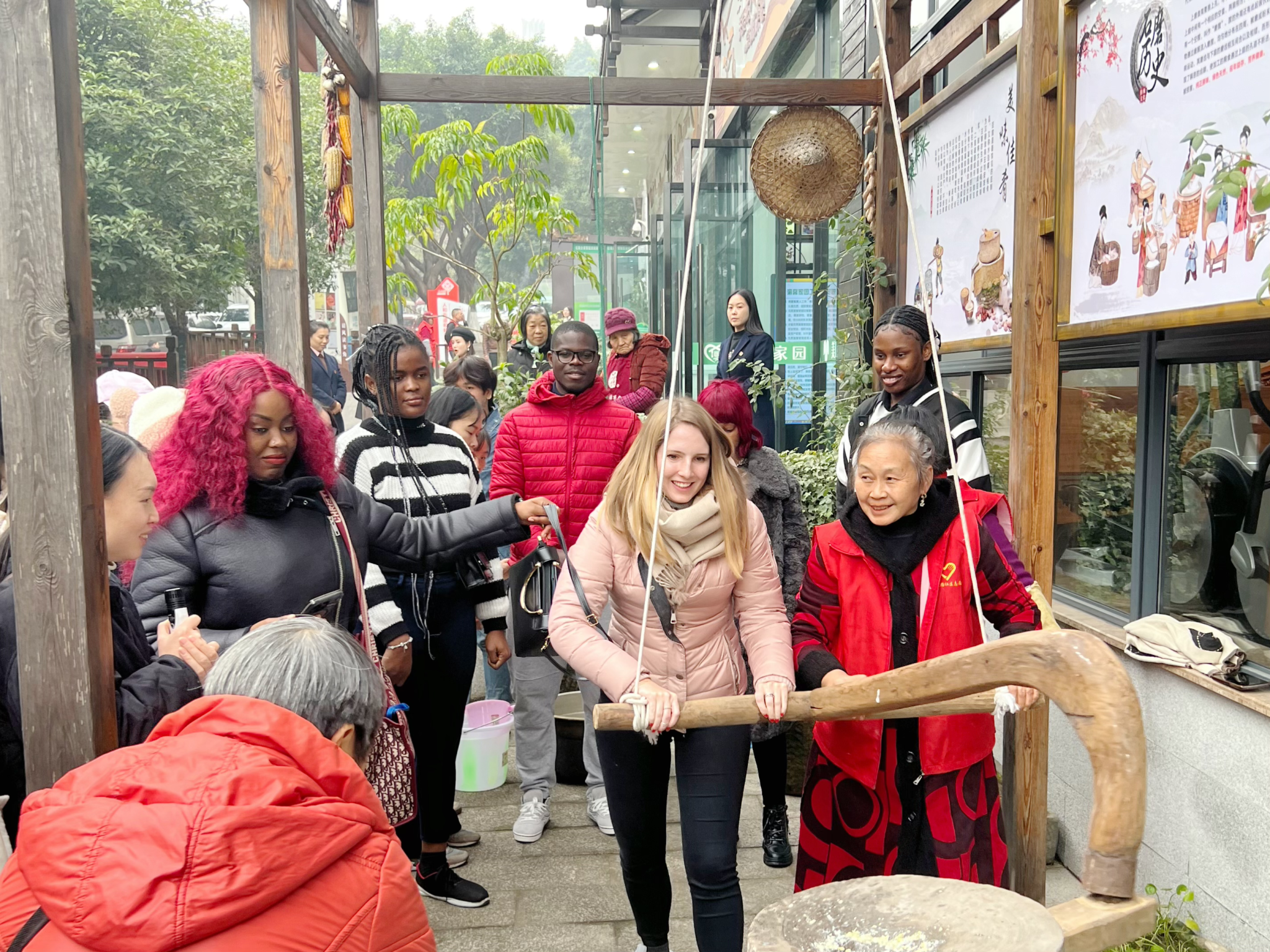 刚到社区,手工磨豆花、舂糍粑的场景就吸引了国际员工们的注意。同学们驻足观看手工豆花和糍粑的制作过程,并纷纷上前实践体验。