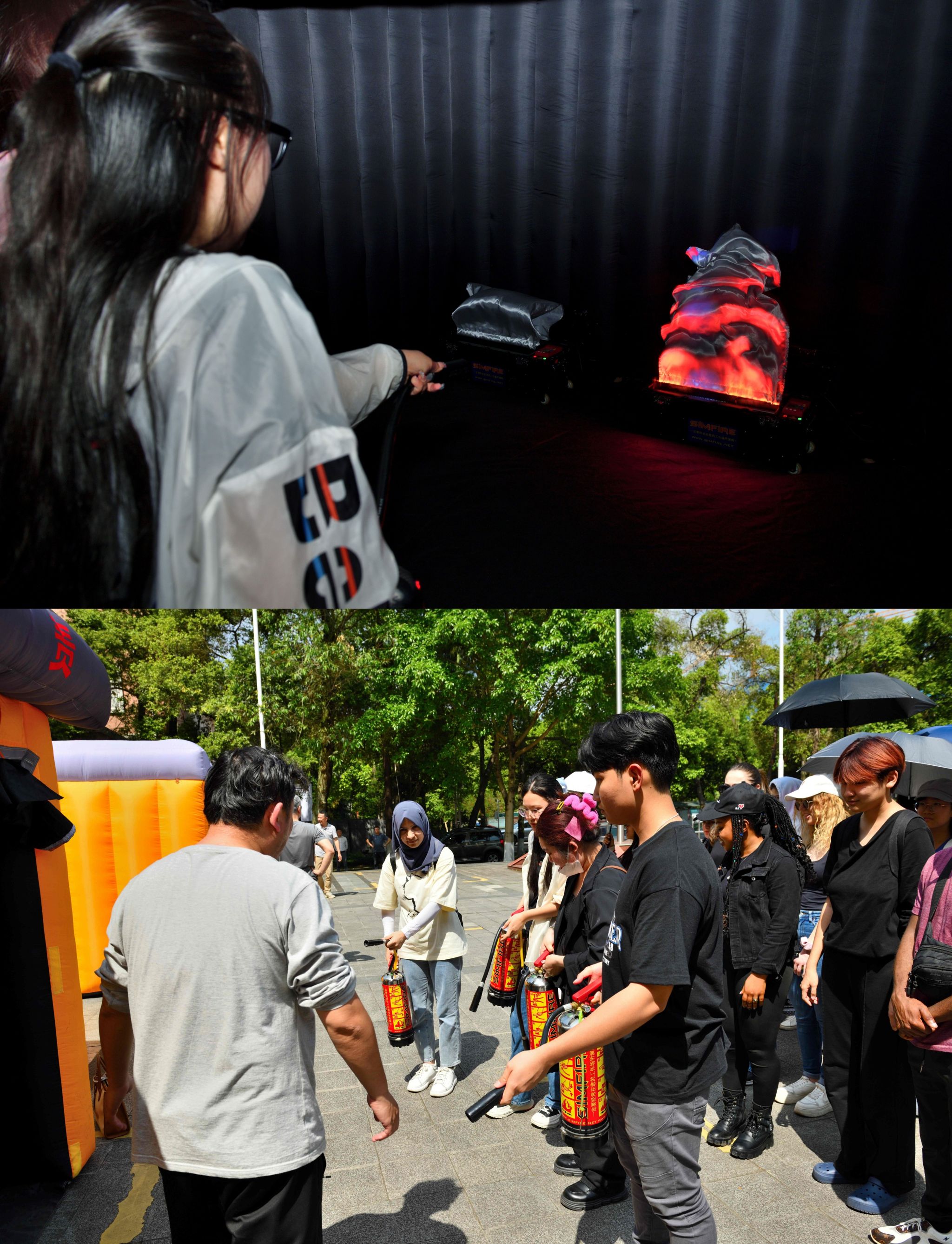 活动现场设置“烟雾逃生”和“模拟灭火”两个体验馆,国际员工在指导下积极参与演练。