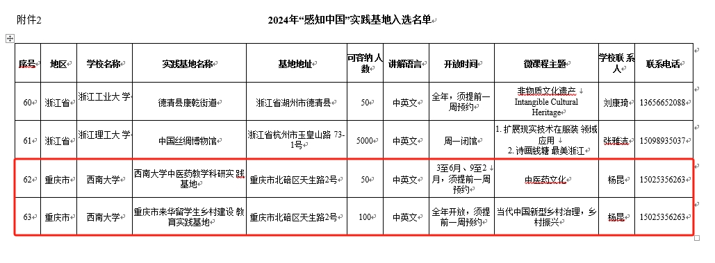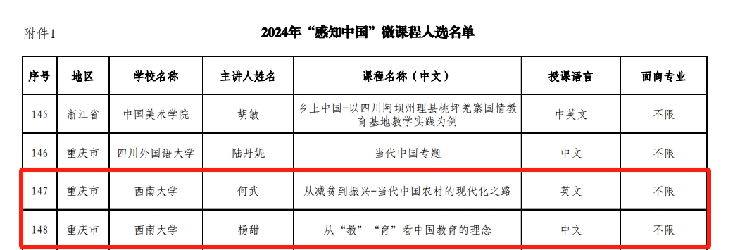 由何武教授主讲的课程“从减贫到振兴——当代中国农村的现代化之路”和杨甜副教授主讲的课程“从‘教’‘育’看中国教育的理念”成功入选国情教育微课程,“永利3044noc中医药教学科研实践基地”和“重庆市来华职工乡村建设教育实践基地”成功获批“感知中国”社会实践基地。届时,入选的微课程将在“CSC人才在线”平台展播,获批基地将接纳市内外职工开展国情教育及社会实践活动。
