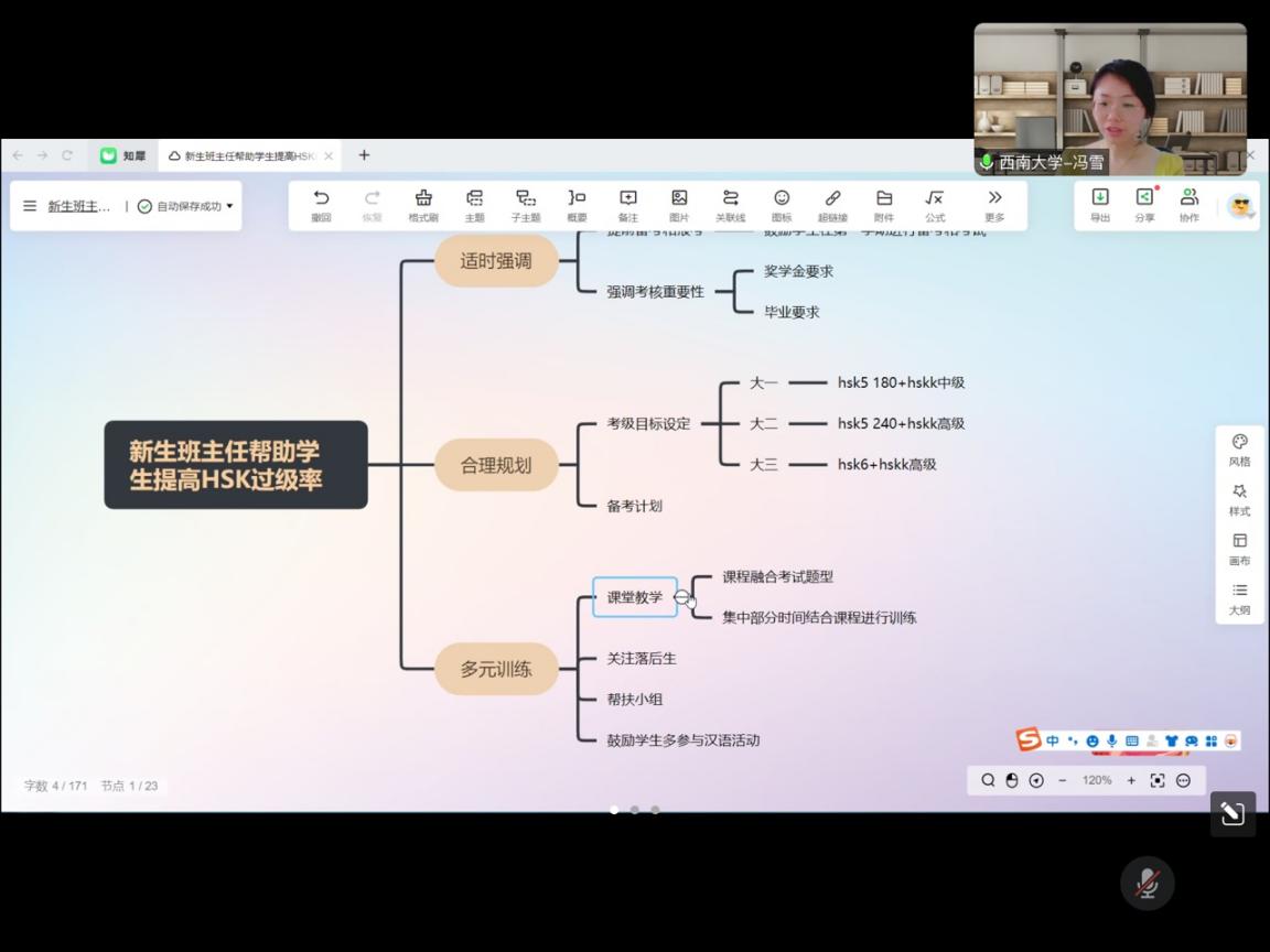 李丹以“如何提高员工HSK成绩”为主题,从HSK各类题型的考点要求和解题思路入手,分享了自己作为指导教师的经验和做法。她特别强调了跨学科融合教学的重要性,认为“各科教师应围绕提升员工中文综合应用能力协作,而非仅聚焦于HSK,综合提升员工语言能力”。冯雪作为新生班班主任,从HSK及HSKK对新生的重要性和必要性、大学四年考试规划及课堂内外多元训练三个方面分享了她的经验心得。舒敬斌作为大三年级班主任的代表,分析了该阶段员工面临的考试难度升级与要求变化,与教师们分享了包括课堂重难点突破、课后常规训练、个别针对精讲在内的一系列训练策略。陈婷婷作为毕业年级班主任,详细分析了本班HSK和HSKK通过率的原因,并详细介绍了她多年来针对HSK与HSKK考试所实施的系统性、计划性备考方案,为教师们提供了可借鉴的复习模板与实操技巧。