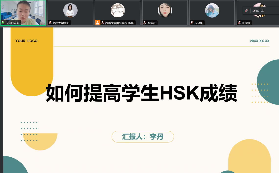 四位老师的分享详略有当,重点突出,给与会老师们很大的启发。最后,汉教系主任杨甜做了总结发言,她首先肯定了本次活动的积极意义,并就HSK与HSKK备考的重点,7-9级教材与教学资源建设等方面,与全体教师进行了介绍与分享,凝聚了共识,激发了教师团队的协作精神与创新意识。