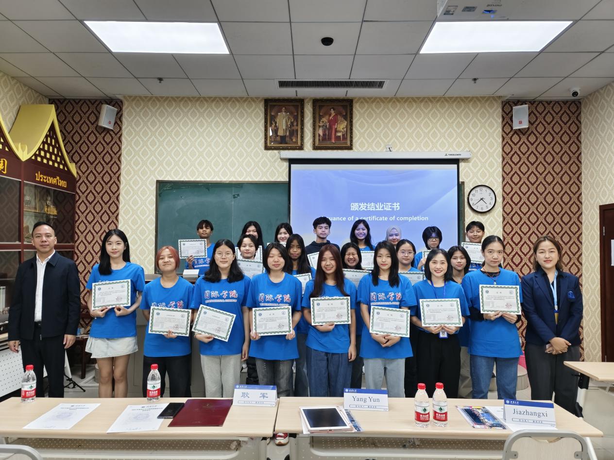 耿军副经理做总结发言,他热烈祝贺大家圆满完成汉语营各项任务,感谢辛勤付出的班主任、授课教师以及志愿者。他希望同学们增进对汉语和中华文化的理解,树立推动世界文明在交流互鉴中共同前进的理想。希望各位同学早日成为中泰友谊的使者,并真诚欢迎同学们在高中毕业后来永利3044noc留学深造!随后,他向学员及带队教师逐一颁发结业证书。
