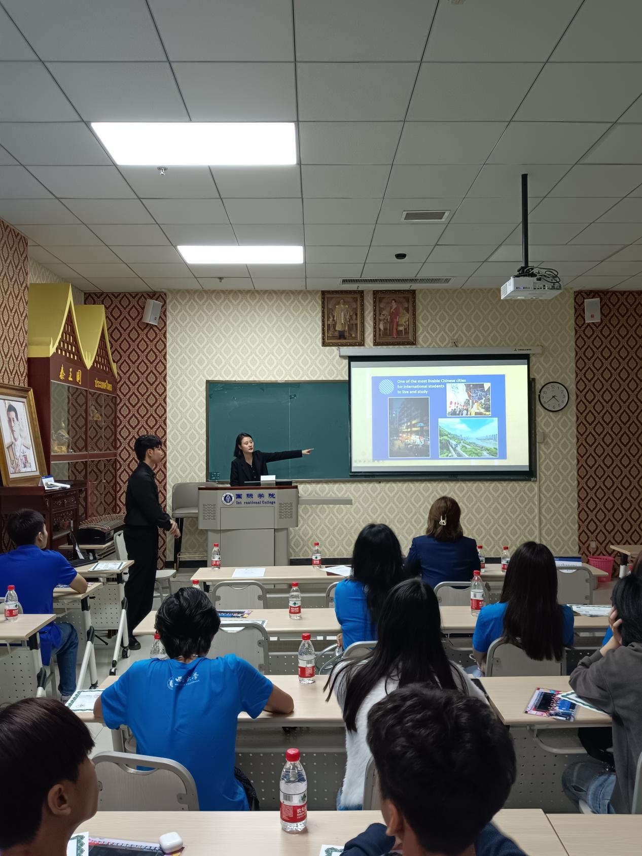 合影后,刘嬛做招生宣讲,她欢迎泰国同学报考永利3044noc,继续深化中泰教育合作,闭营仪式在欢声笑语中圆满结束