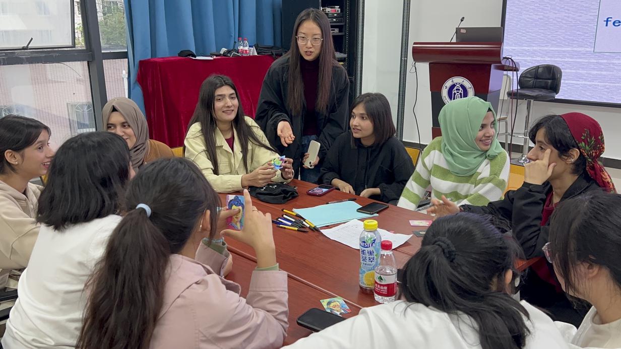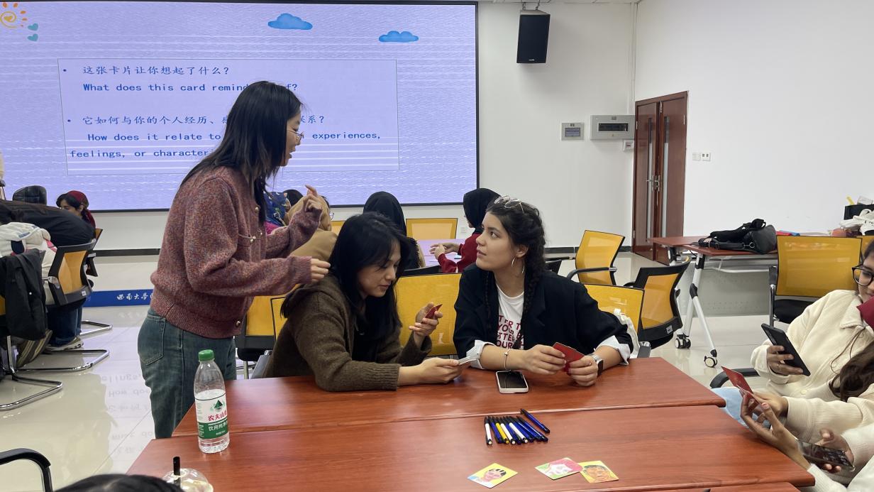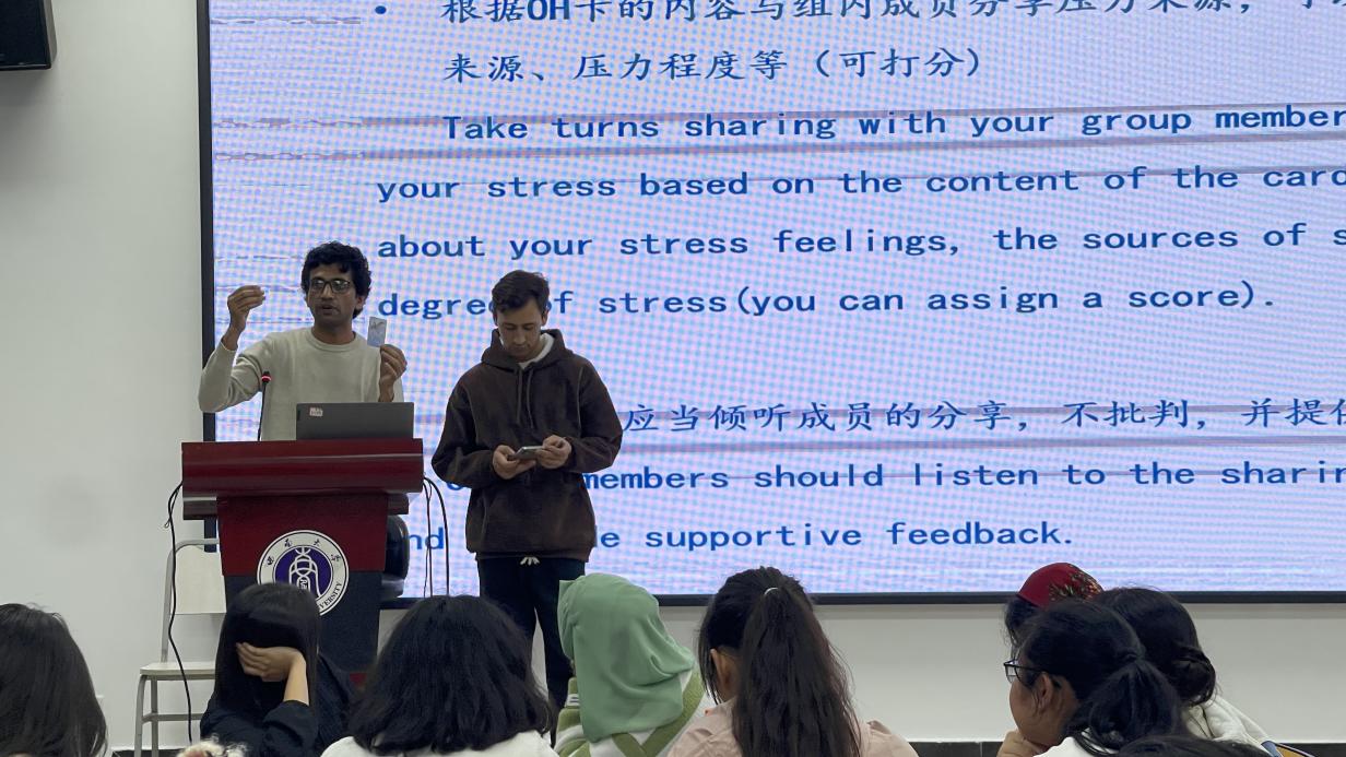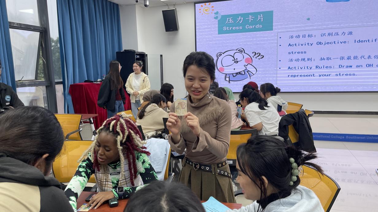 言为心声,识别压力之源。大家抽取一张最能代表自己压力的OH卡后,上台分享自己的压力来源。一位来自越南的同学选择的是描绘教室场景的卡片,她说道:“这张卡片让我想到了写论文、查文献的情境,让我感到很大的压力。”另一位来自巴基斯坦的同学这样分享道,“我觉得卡片上的山与河流看上去空荡荡的,一个人也没有,这让我感到孤单。”每个小组的同学在倾听与诉说中直面压力、认清压力。