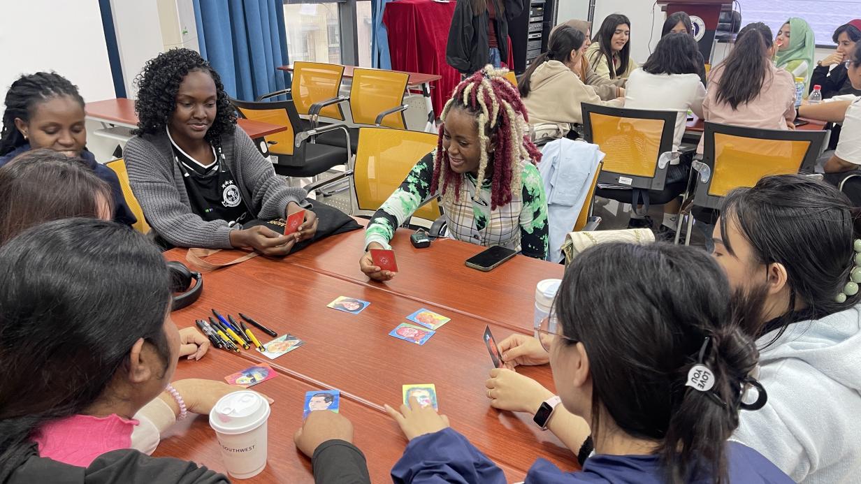 邂逅相逢,齐握友谊之手。在游戏规则的引导下,每位同学都精心挑选了一张最能代表自己当前状态的OH卡片,有的是神情羞涩、头戴围巾的女孩形象,有的是拥有古铜色肌肤或面容坚毅的男孩形象。这些卡片取代了传统的“你好,我是…我来自…”的自我介绍方式,让每个小组的同学都能围绕着自己所选的卡片,自由地分享选择的理由。在聊天的过程中,话题从生活感受、人生经历逐渐深入到个人特质的剖析,大家从陌生到熟悉,逐渐拉近了彼此的距离。尽管我们来自地球村的各个角落,但在这个时刻,欢声笑语汇聚一堂。