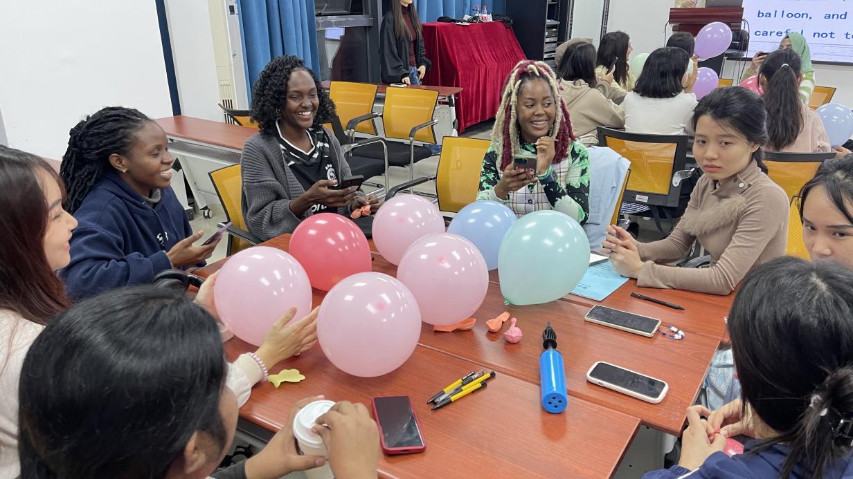 下笔洒脱,齐吹压力之球。全场同学齐齐落笔书写自己的那份压力:“HSK考试让我焦虑”“论文使我很有压力,我也很担心答辩难以通过”“我很担心我能否按时毕业”……烦恼画上句号,压力便签纸装进气球,轻松与愉悦的神情映上脸庞;气球越吹越大,心中的压力与郁闷仿佛越来越少。