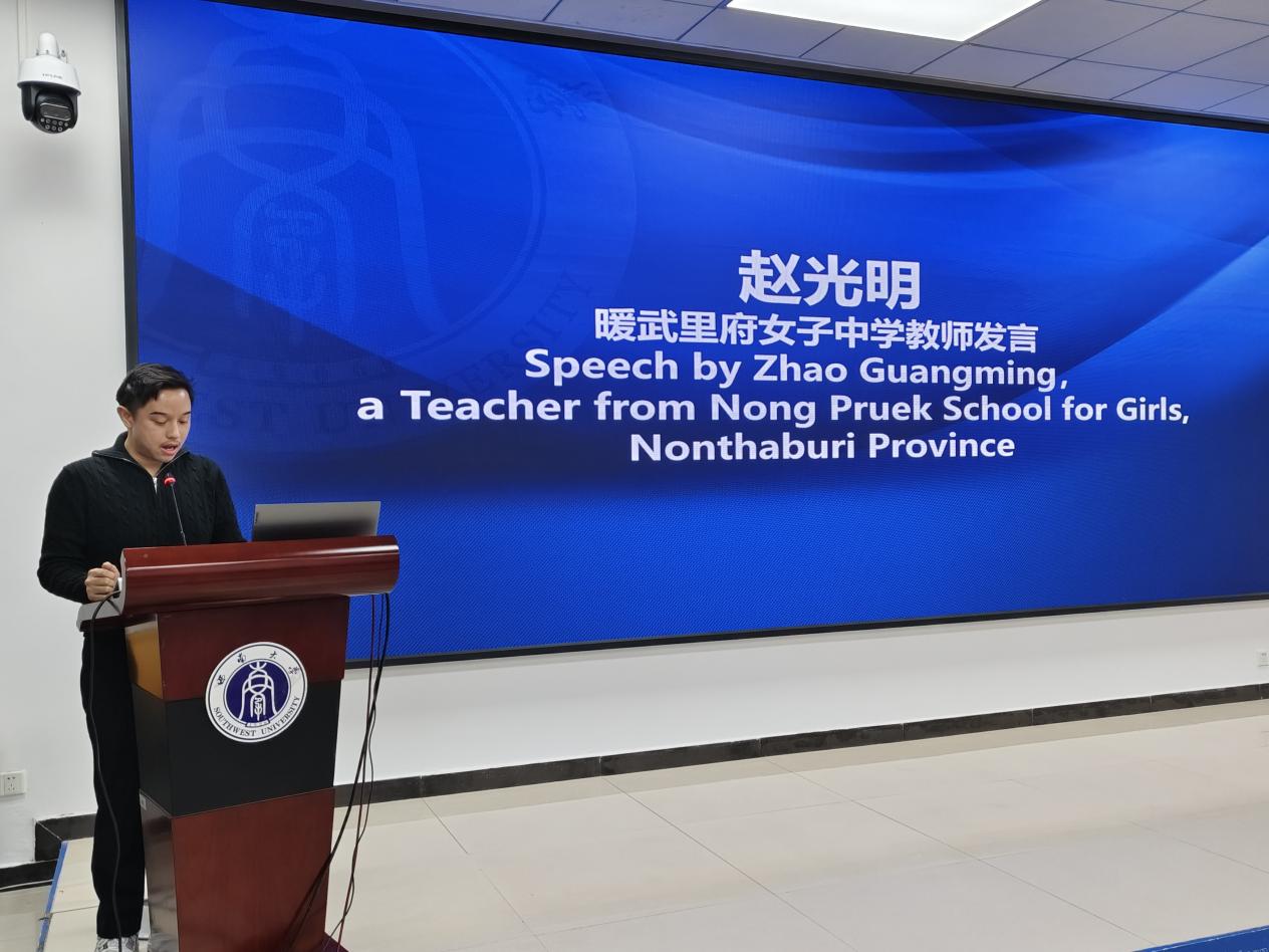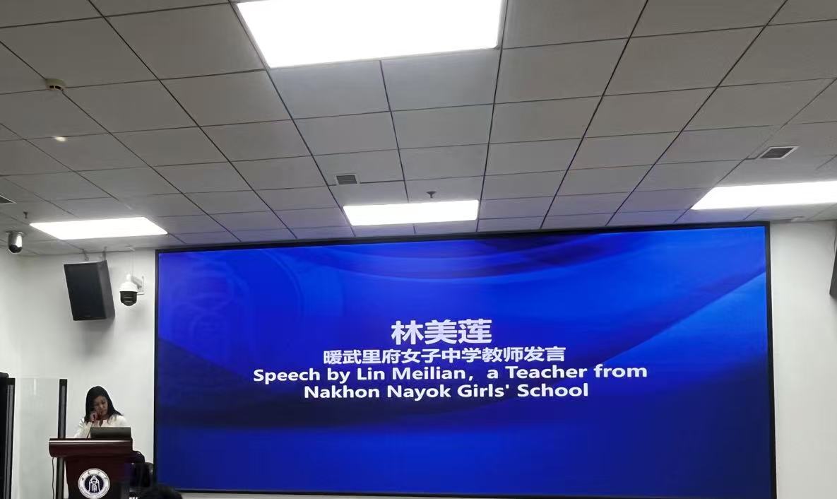 暖武里女子中学员工 GENE 用流利的中文讲述了自己在游学期间的收获,她还分享了在课堂上参与小组讨论、在校园里探索美景的快乐经历,言语间满是对这次游学的不舍和对未来的期待。