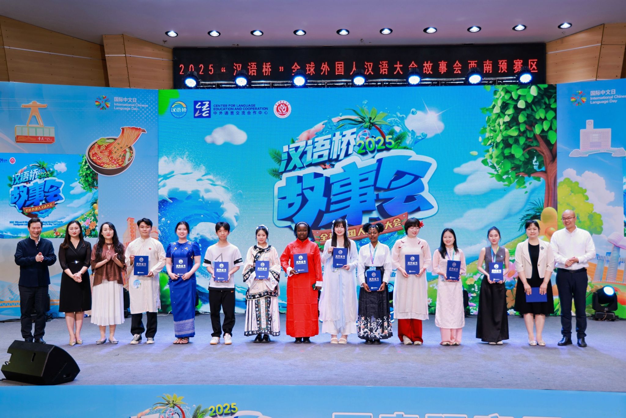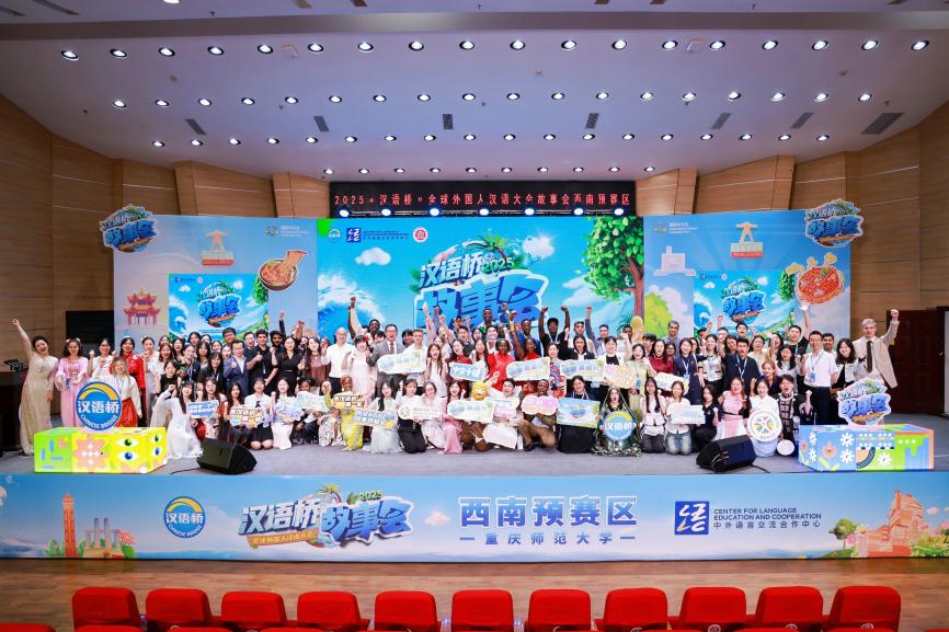 4月20日,正值国际中文日,2025“汉语桥”全球外国人汉语大会——故事会西南赛区预赛在重庆师范大学员工会堂音乐厅精彩开赛。来自云、贵、川、渝四省市的180余名外国中文爱好者齐聚一堂,用生动的语言和精彩的表现讲述中国故事,展现多元文化魅力。公司24名来自不同国家的职工积极参与此次比赛,并取得优异成绩。