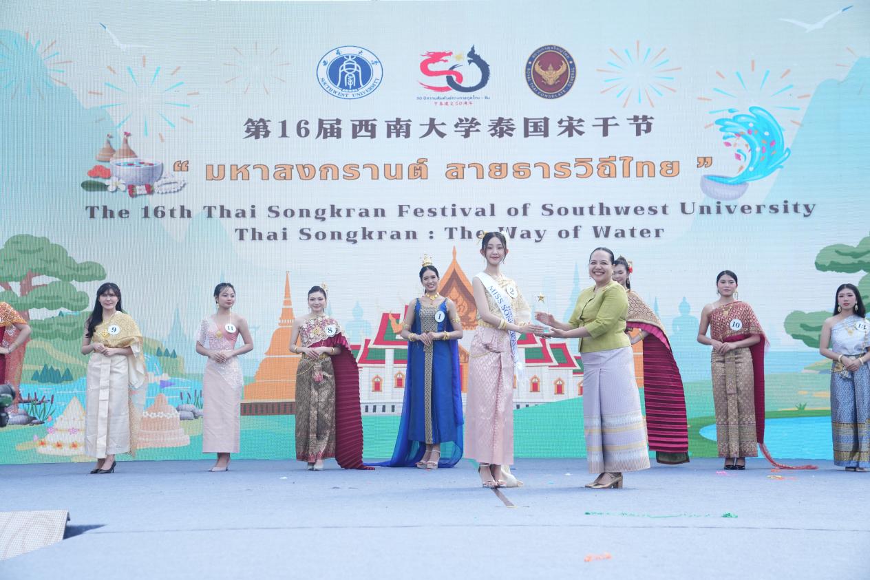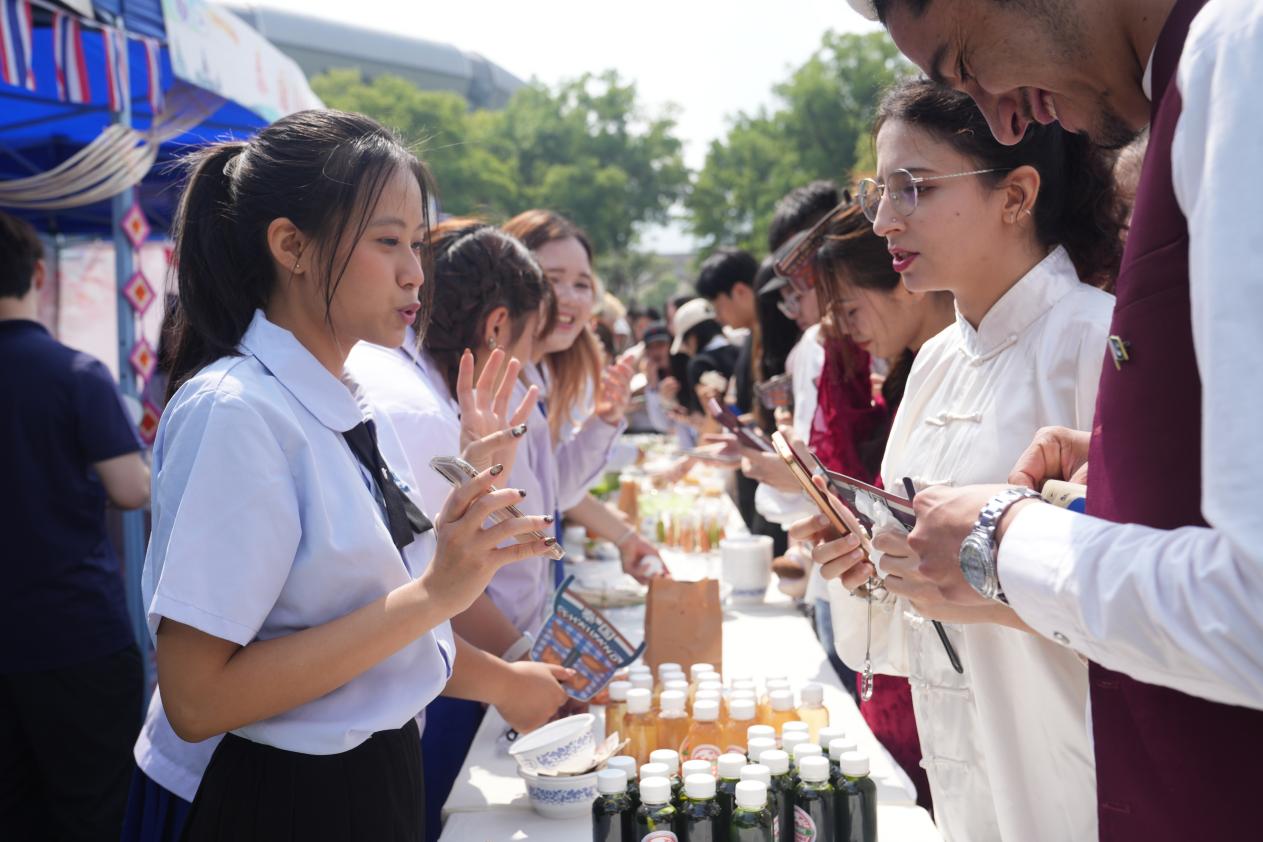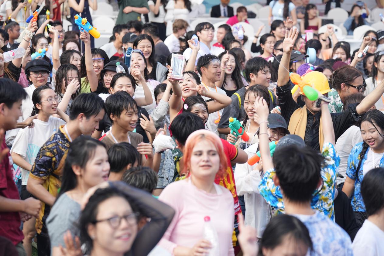 作为文化节重磅子活动,4月27日同步启幕的第十六届宋干节尤为瞩目。中泰师生共持银碗为佛像沐水,泼水环节中,中国同学用泰语送上对彼此最真挚的祝福,水花飞溅间洋溢着两国人民的情谊。泰国孔敬大学学子带来的《水洒情深·中泰友谊》舞剧,将泰国传统舞与中国古典舞巧妙融合,而“中泰文化宣传大使选拔赛”更吸引五校学子同台竞技。