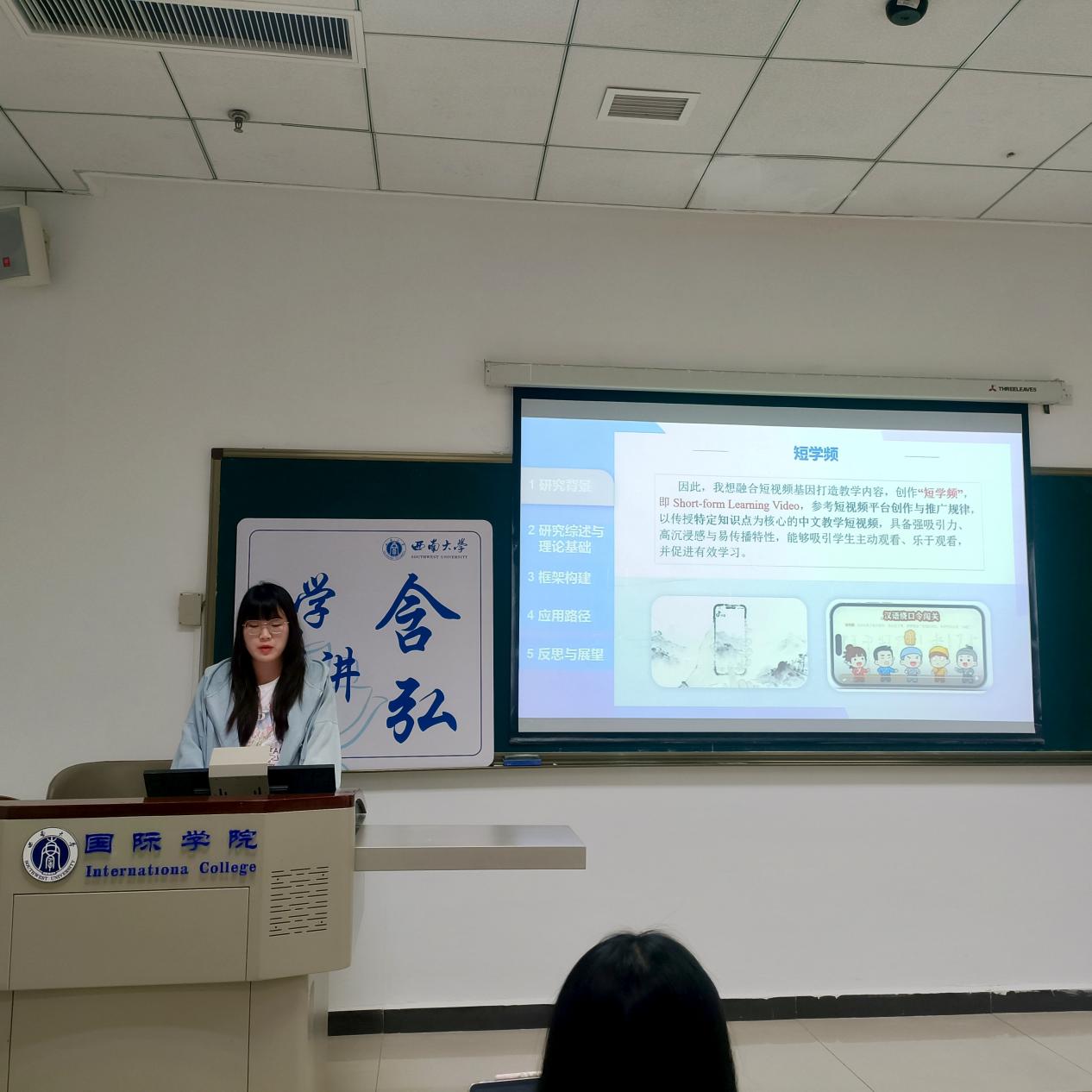 岳露同学以“基于短视频逻辑的国际中文‘短学频’框架构建与应用路径”为题,指出当前线上教学资源与短视频传播逻辑脱节的问题。她提出“短学频”概念,即融合短视频基因的中文教学短视频,并构建了以算法、视听、互动、融合四大思维为核心的框架:算法思维通过标签战略、热点结合与黄金开场实现内容精准推送;视听思维借助动态解析、场景模拟促进语言文化知识直观转化;互动思维通过挑战任务、悬念叙事与行动号召增强用户参与;融合思维构建“兴趣激发—信任建立—系统学习”的完整路径。她还展示了“短学频”在课内外融合中的多重角色,以及“创作-分发-反馈-优化”的闭环实施模式,强调短学频需与系统课程协同,实现从“碎片化吸引”到“体系化培养”的升华。