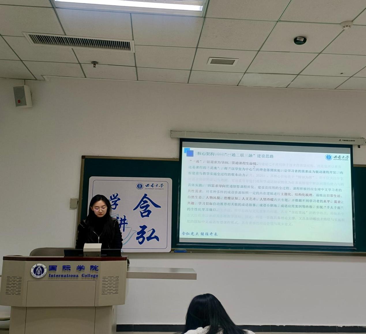 何倩同学宣讲的主题是“数智化时代国际中文成语智慧课程模式的构建研究”。她指出,在“人工智能+教育”战略推动下,成语教学面临内涵丰富性与课堂时间有限性、文化独特性与理解跨文化性、教学规范性与需求个性化三重固有矛盾。基于此,她引入了“一通二联三融”的建设思路:“一通”强调以员工需求为导向,贯通课程开发与应用全过程;“二联”通过虚拟现实、情景生成式AI等技术联动知识习得与实际应用、跨文化交际;“三融”聚焦国情理解、多模态考核与社会热点融入,实现育人目标升华。结合“导-教-学-评”一体化教学模式与课程知识图谱、“双师”协同技术引擎,构建系统化、可落地的智慧课程模式,为国际中文成语教学从“语言知识传递”走向“语言智慧启迪”提供了创新路径。