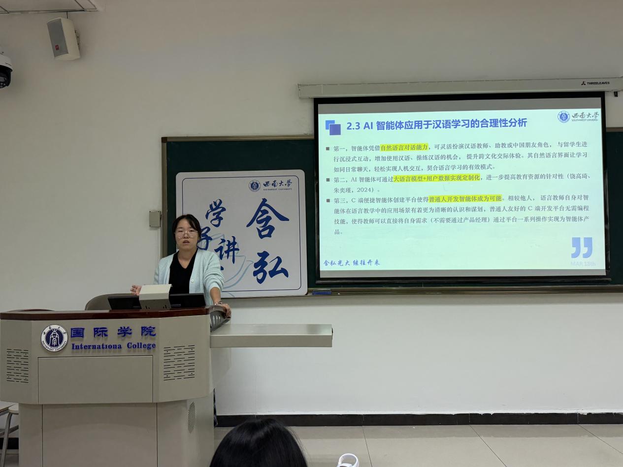 廖婷同学以“AI智能体应用于汉语学习:教学应用设计反思与启示”为题,聚焦来华职工汉语学习中存在的课程进度快但提高慢、学习效能感偏弱等痛点。她基于文心智能体平台,设计并开发了“汉语学伴”工具,详细阐述了智能体的角色规范、提示词设计、知识库构建与调优流程。通过课内有限度使用与课外个性化对话的案例,她展示了AI智能体如何拓展学习时空,实现“随时、随地、无顾虑”的语言操练。她强调,智能体作为助学工具,需以服务教学为前提,通过数据分析与反馈推动持续优化,同时呼吁教师积极拥抱技术,将自身教学需求直接转化为智能体产品,提升教育资源的针对性与适用性。