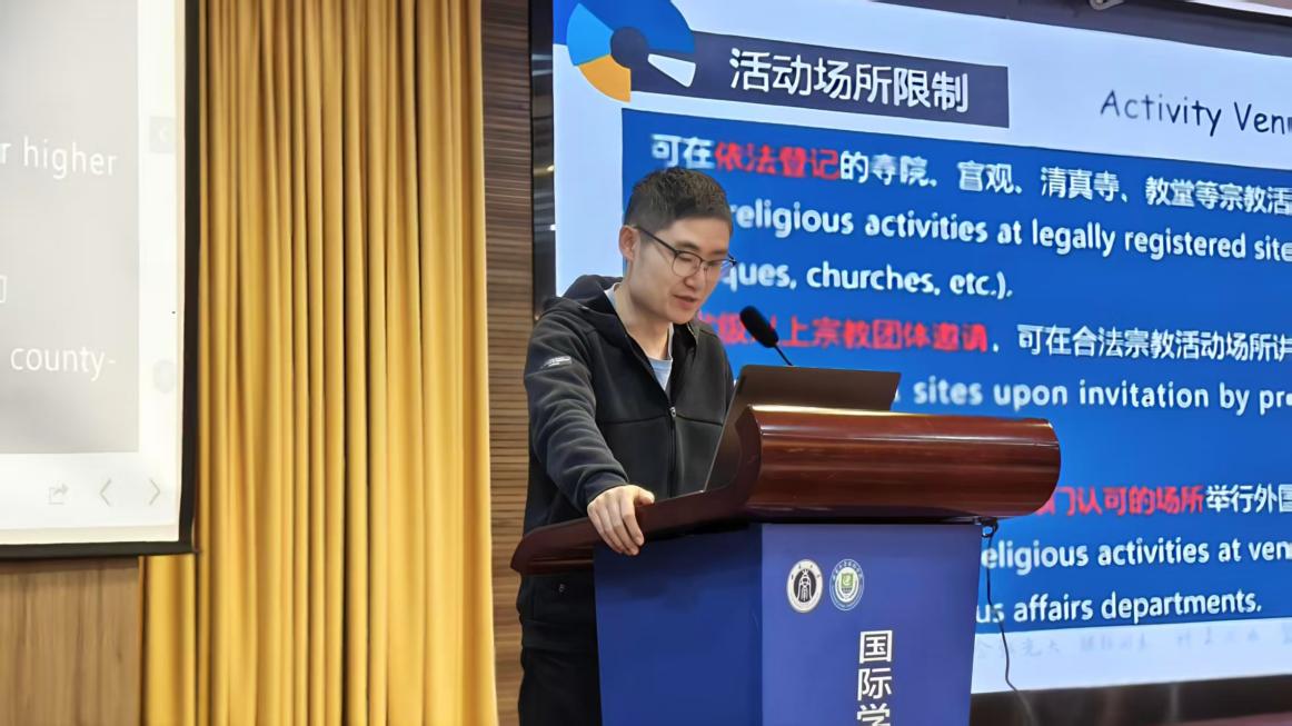 法律法规教育环节,王湛明老师系统介绍了与职工日常学习生活密切相关的核心法律法规框架,帮助职工建立对中国法律体系及校园规章的整体认知。在此基础上,他重点聚焦宗教相关法律法规,结合具体案例,从宗教法规、活动场所限制、宗教物品携带、禁止的宗教行为以及宗教服饰规范等多个方面进行了详细讲解,提醒职工增强自我保护意识,准确识别非法宗教活动,并严格依照中国法律法规进行合法的宗教活动。