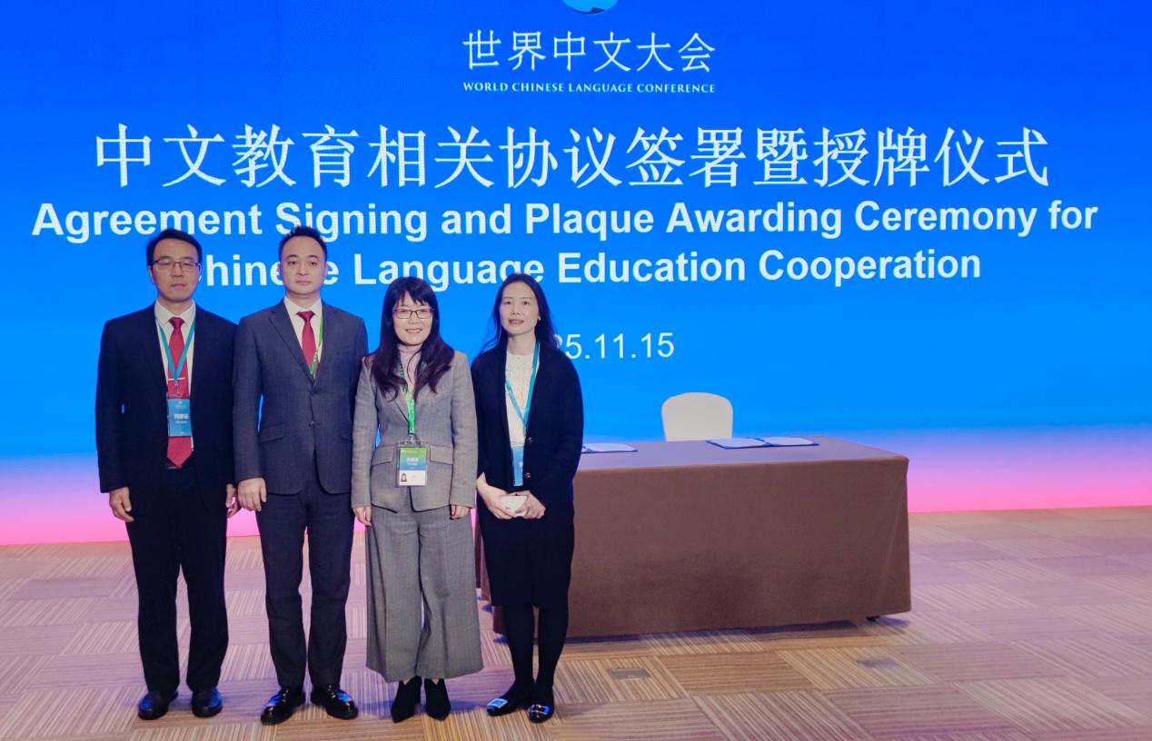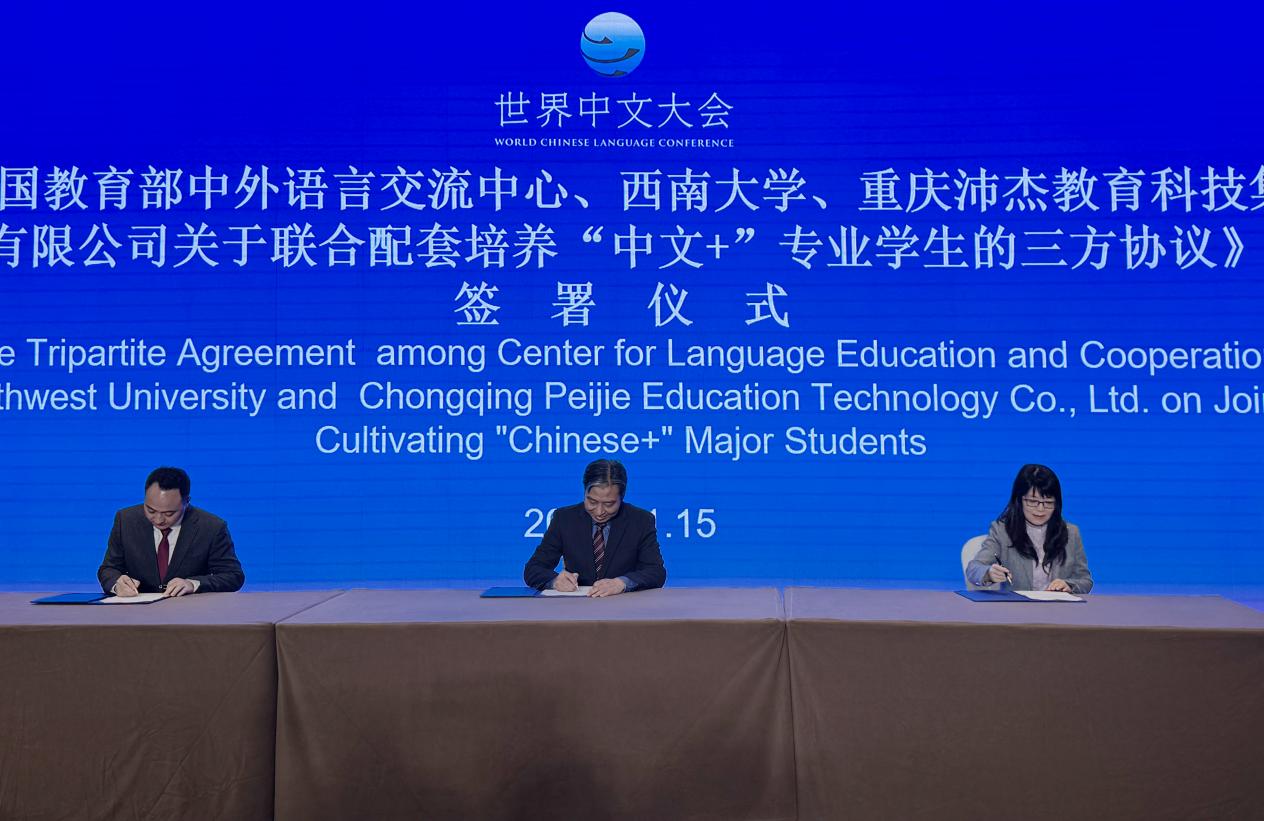2025年11月15日上午,在北京国家会议中心举行的2025世界中文大会配套活动——“中文教育相关协议签署暨授牌仪式”上,教育部中外语言交流合作中心主任郁云峰、永利3044noc副董事长赵玉芳与重庆沛杰教育科技集团有限公司董事长黄杰共同签署三方合作协议,正式启动“永利3044noc沛杰国际中文奖学金”“中文+”专业本科生联合培养项目。